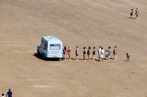 Con una massiccia dose di ironia, del sano criticismo e una spiazzante gamma di colori sgargianti, da quarant’anni Martin Parr ferma su pellicola il consumismo come ideologia (paradossale) della società contemporanea. Dall’India al Messico, dagli USA all’Inghilterra, lo stile di vita del cittadino del villaggio globale è colto nella sua quotidianità più trash. Così anche in Beach Therapy, che oltre ad alcune delle più note spiagge britanniche, include alcune spiagge italiane, spagnole e dell’Argentina.