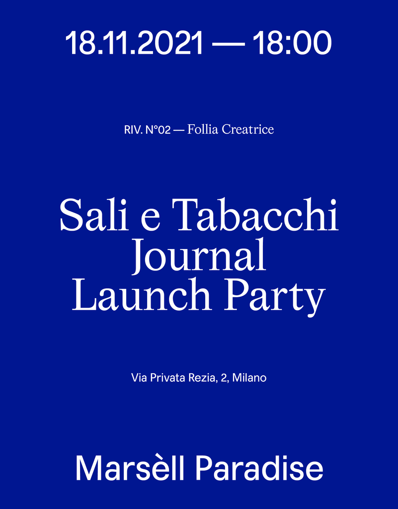 È il 2021, e Sali & Tabacchi Journal, che fu parte di quel boom della carta stampata di cui vi avevamo parlato qui, in quel mondo distante, lontano, parallelo e obliato di un fine 2019 prepandemico, diventa di anno in anno più grande. Dal n.0 che fu una vera e propria presentazione d’intenti, “Sensazioni Familiari”, sulle origini e le radici, a “Spiritualità”, il n.01 avvolto nei toni di “Sud e Magia” di Ernesto De Martino e quindi psicopompi e pagani, stregoni e maghi tra feticci e talismani – per cui alla presentazione del numero a Riviera vennero esposti 6 oggetti da 6 designer incaricati di lavorare sul tema –, eccoci all’uscita del terzo: “Follia Creatrice”, che verrà presentato giovedì 18 da Marsèll Paradise alle 18:00. Ma eventualmente il pre-order è già disponibile sul sito.