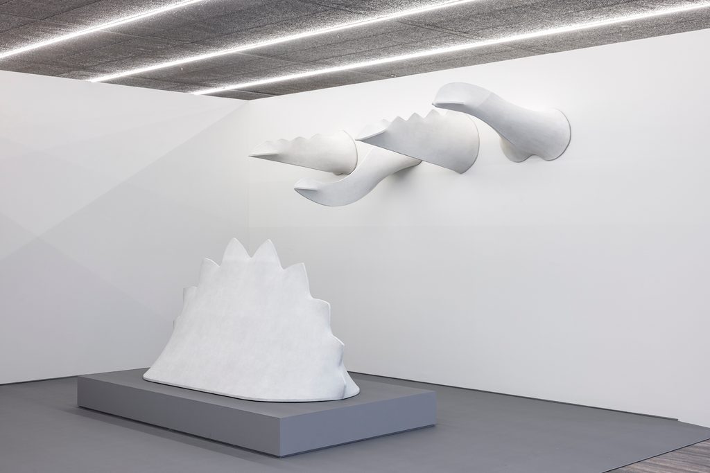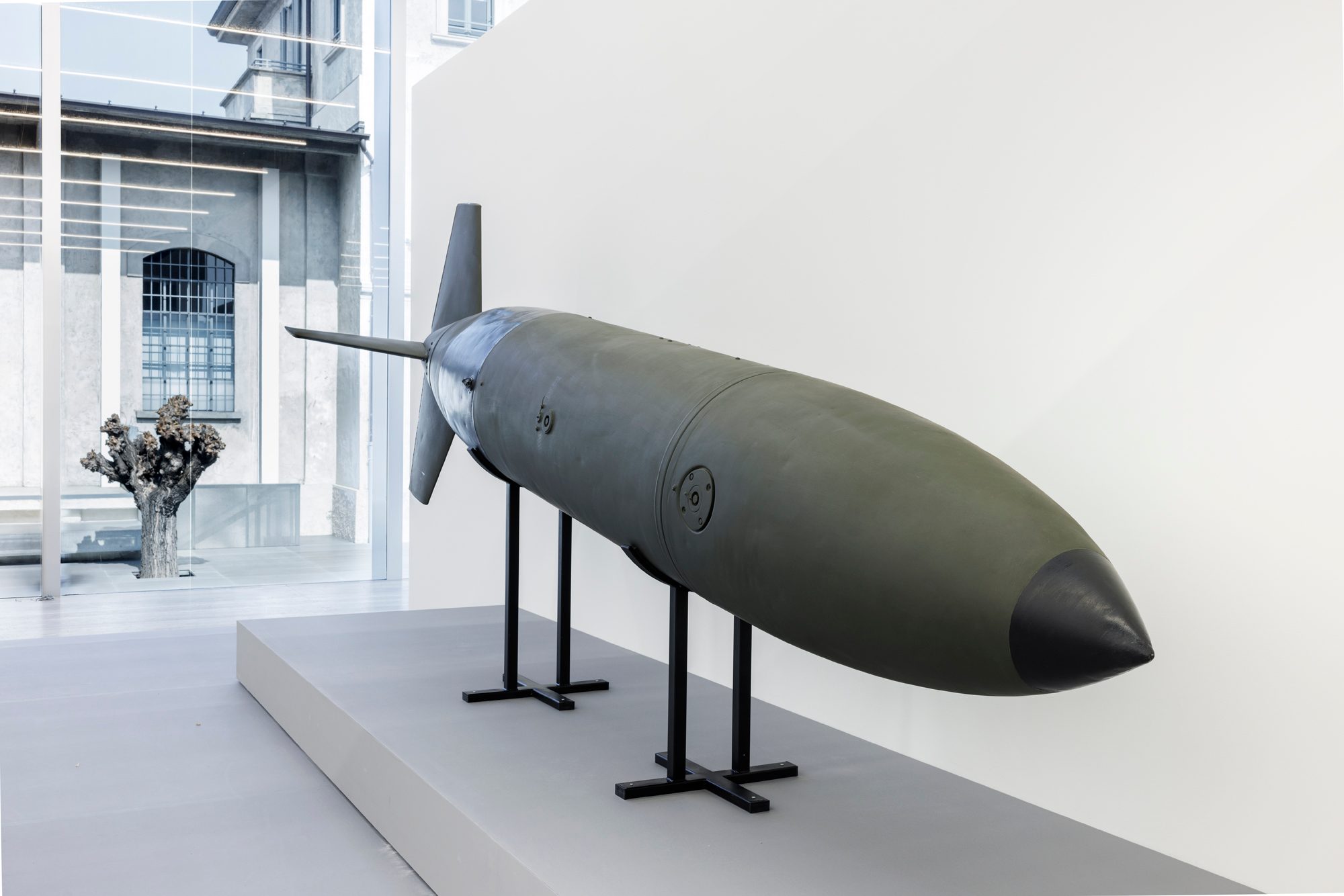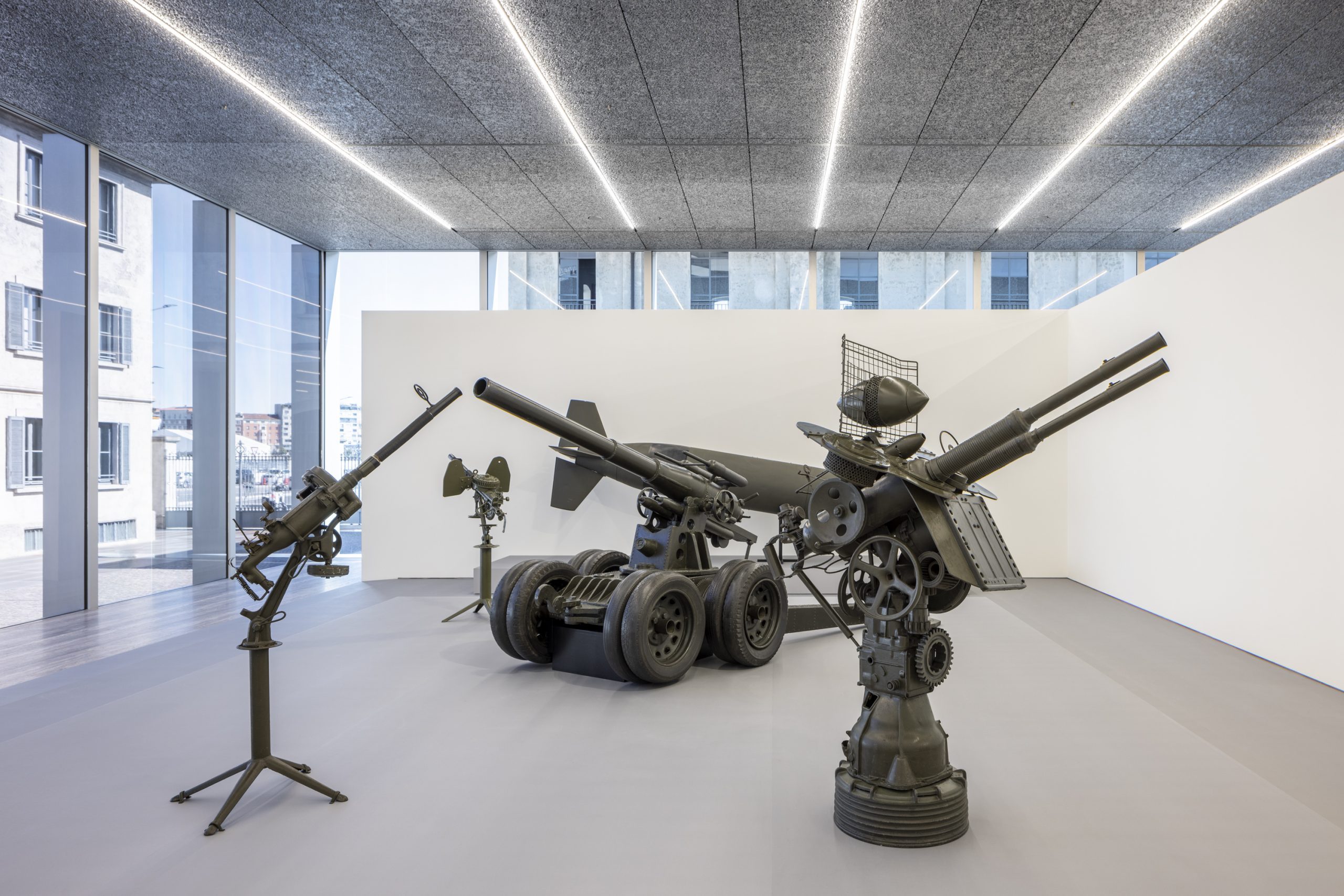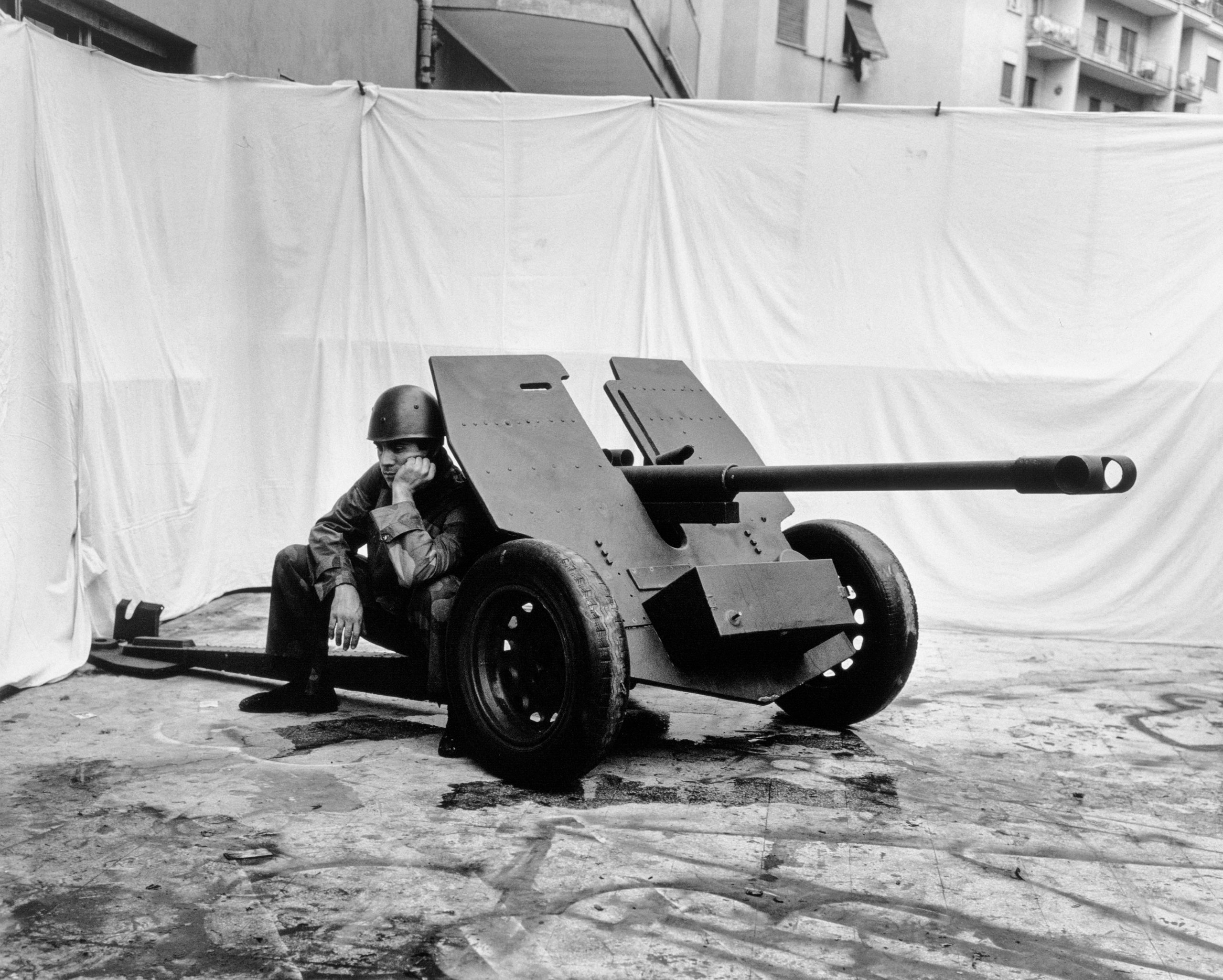 La sua folgorante e brevissima carriera – morì a soli 32 anni in un incidente in moto – è raccontata attraverso quattro nuclei espositivi, in un percorso a firma di 2×4 che include quarantanove opere: nel Podium, sono nuovamente allestite cinque mostre personali realizzate tra il 1965 e il 1968, e che documentano la furia creativa di Pascali in risposta alle reazioni alla 32esima Biennale d’Arte del 1964 (la scandalosissima biennale degli americani, con le sue porte aperte alla Pop Art). Qui, avventure favolose di animali preistorici, draghi e giraffe riemergono dal subconscio. Al centro del Podium, una colonna è attraversata da un corpo di delfino, parte dell’allestimento del ’66 Pino Pascali. Nuove sculture, che negli spazi della galleria romana L’Attico si completava di ventiquattro pannelli di onde trafitti da un fulmine. Ancora negli spazi del Podium, l’“arsenale” di macchine da guerra (finte, ma sorprendentemente verosimili) esposto da Gian Enzo Sperone a Torino nel 1966, che, secondo il racconto del gallerista Giorgio Frachetti fu trasportato in un furgone con alla guida Pascali stesso. Fermato dalla polizia, non fu facile spiegare l’oggetto a rimorchio era in effetti di un cannone, ma innocuo.