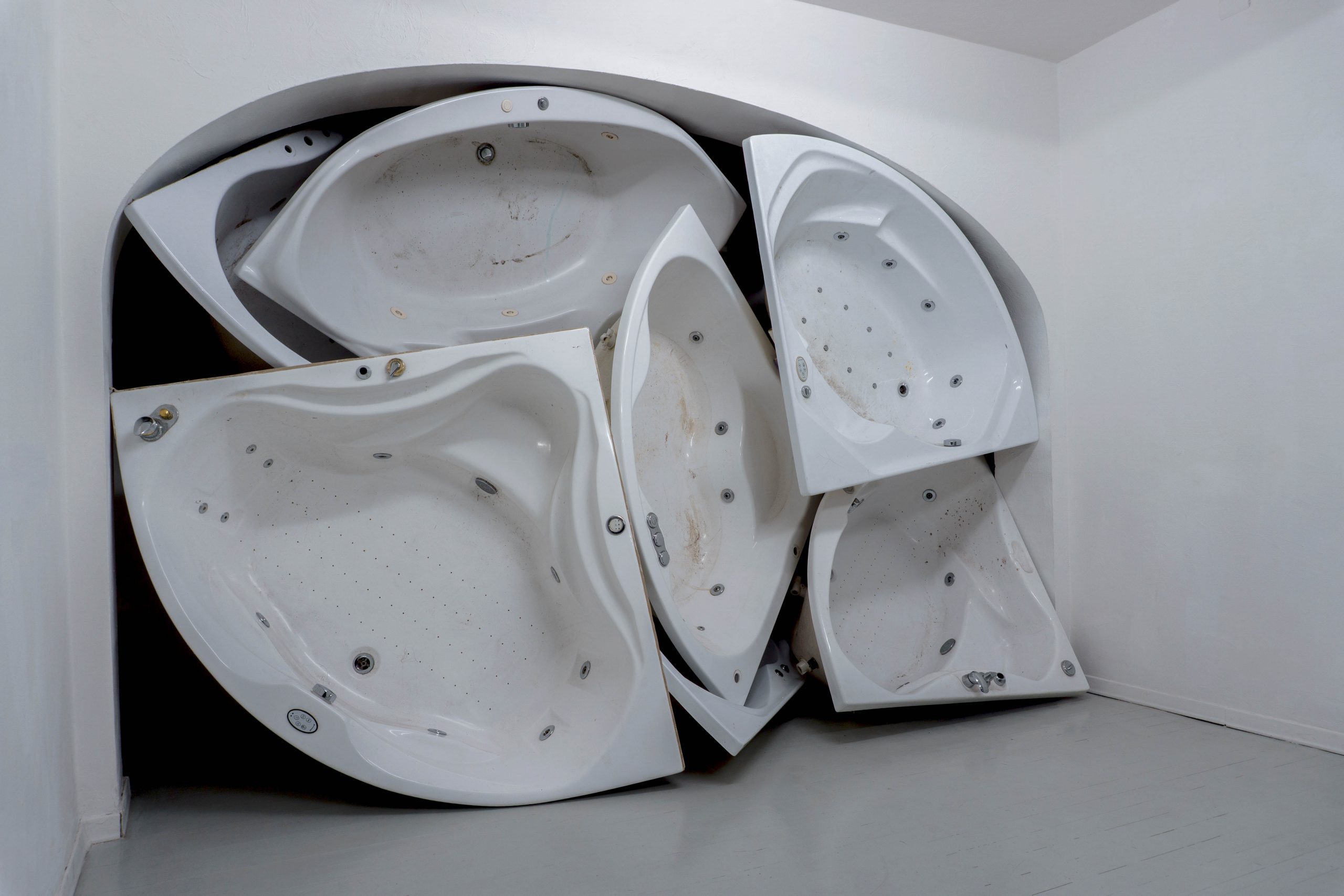 Charlotte Thrane combina più vasche in un unico corpo, elevandole a simulacri di benessere e solidità tecnologica – punti di riferimento per l’industria del design innovativo, promesse di comfort, macchine di piacere. Riducendo le vasche a geometrie essenziali, genera un’astrazione di elementi sia scultorei che pittorici.