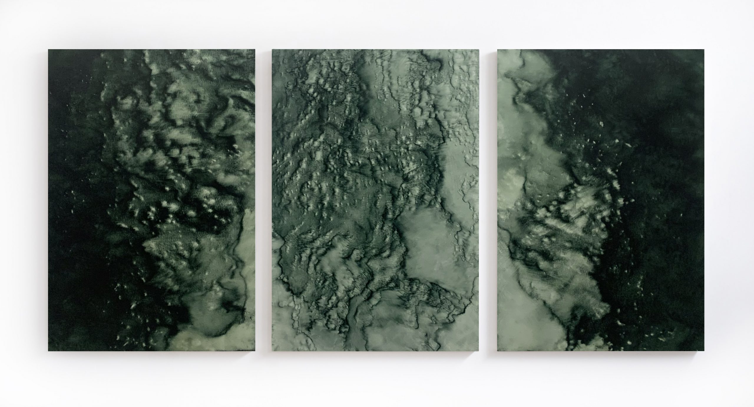 Linda Carrara, Passeggiata (verso sud), 2025, acrilico su tela, trittico 65 x 45 cm ognuna
