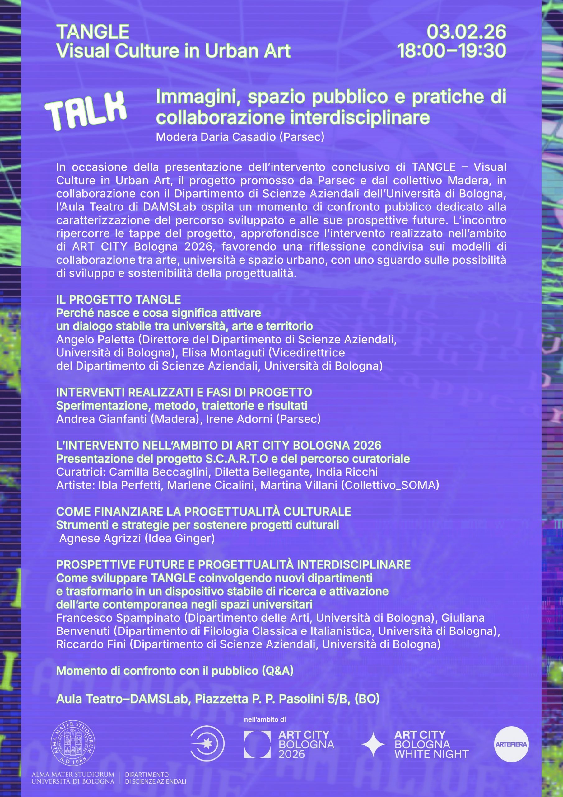 TANGLE – Visual Culture in Urban Art: Immagini, spazio pubblico e pratiche di collaborazione interdisciplinare, si svolgerà il 3 febbraio 2026 dalle 18:00 alle 19:30 presso l’Aula Teatro, DAMSLab, in Piazzetta P. P. Pasolini 5/b, a Bologna.