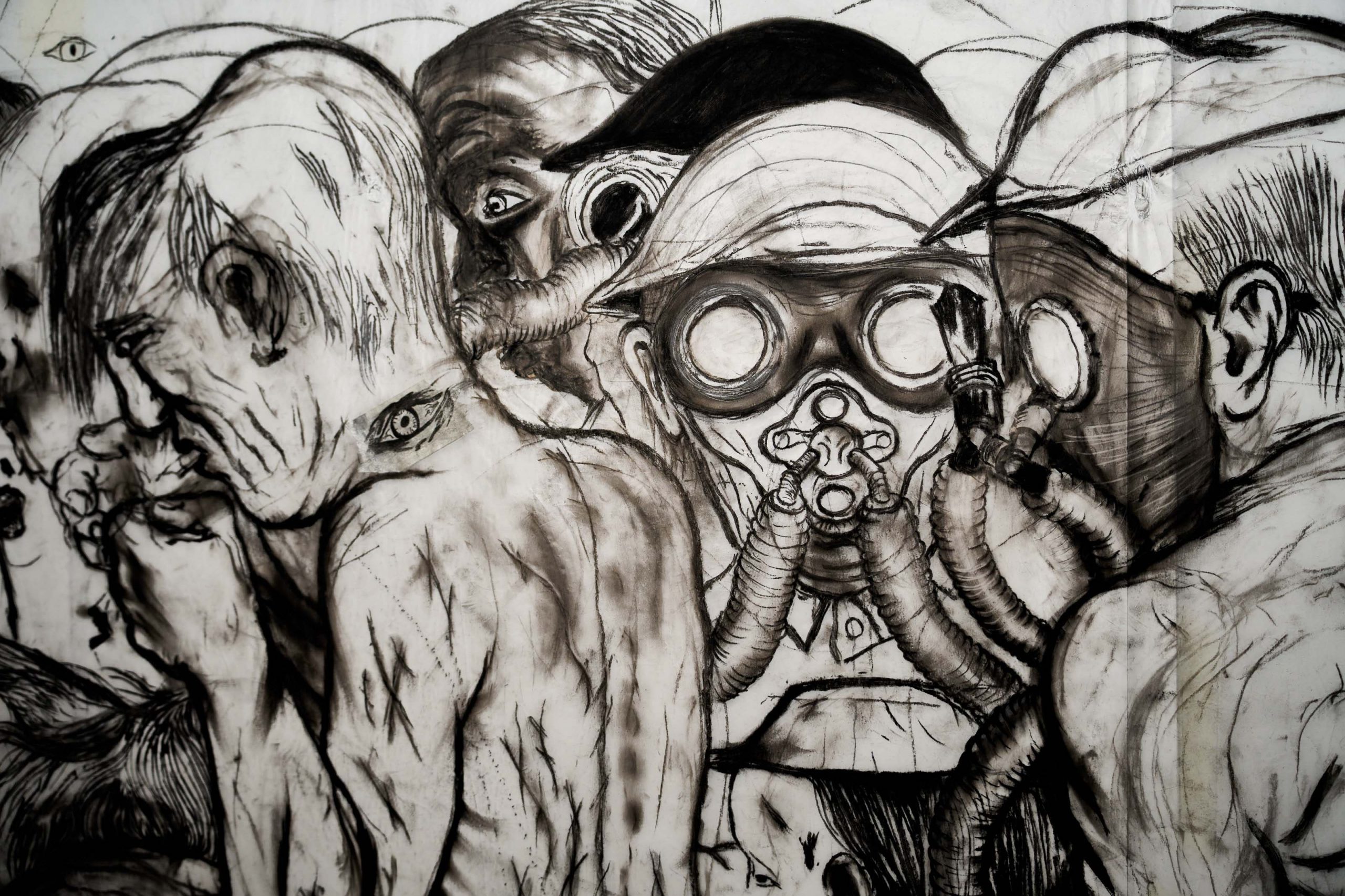 Tra sguardi perduti, antri fuligginosi, nani, arti, pupille, maschere e baracche, il mondo a carboncino di Estrazione prende vita e trascina chi guarda nelle profondità più oscure di altri e nostri tempi attraverso una materia scura, che si posa su ogni cosa.