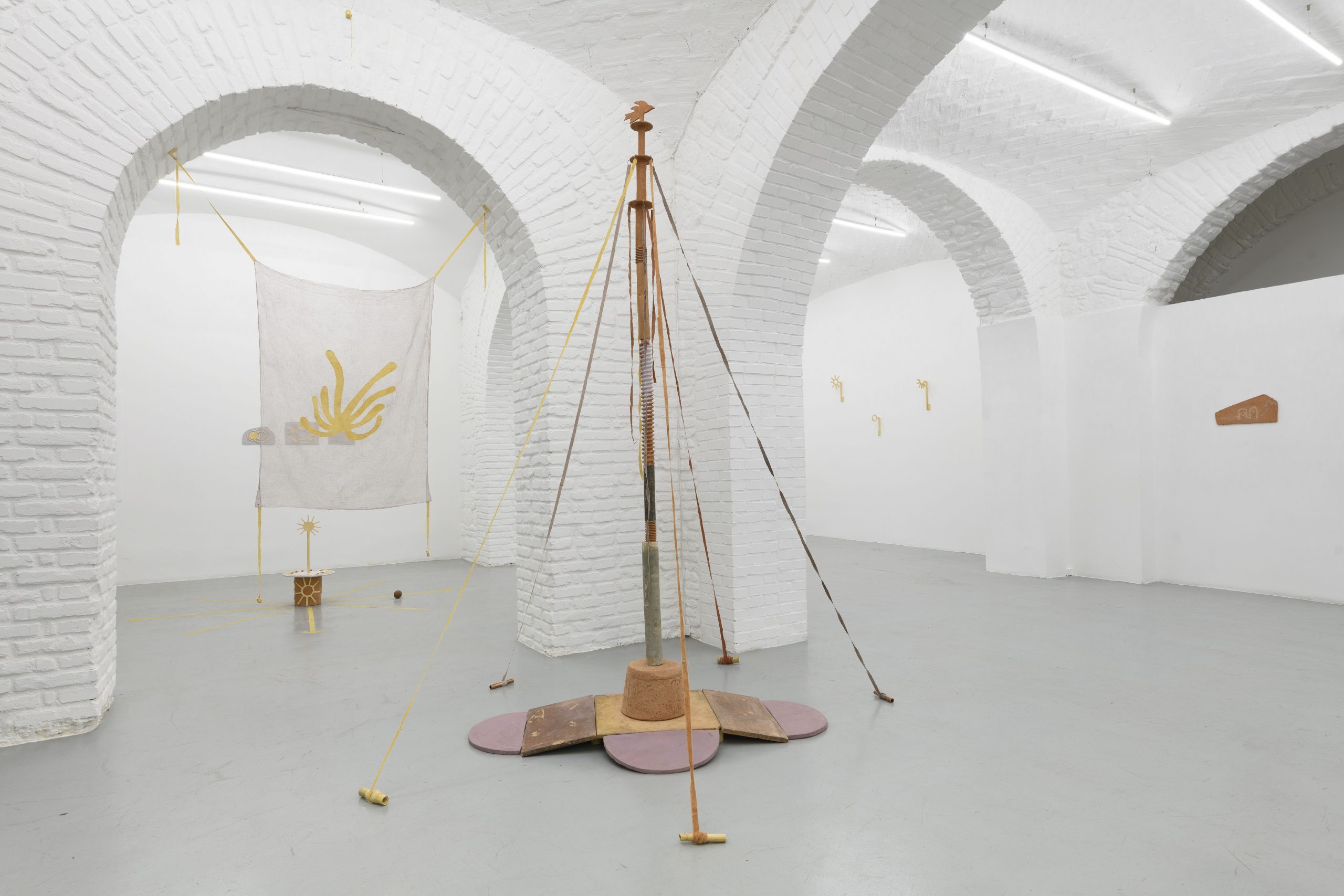 Le sfide ecologiche e le ansie climatiche sono una realtà costante per tutto il pianeta, in particolare per alcune regioni, tra queste Alentejo, luogo del cuore per l’artista. Il legame con la propria terra d’origine è stretto, viscerale, ed evidentissimo. I colori terrosi, tessuti trattati con pigmenti naturali, l’utilizzo di materiali provenienti dalla terra e l’abbondanza di argilla ci catapultano con lo sguardo e con l’olfatto (la galleria è pervasa da quei sentori caratteristici dati dalle terrecotte e pigmenti naturali).