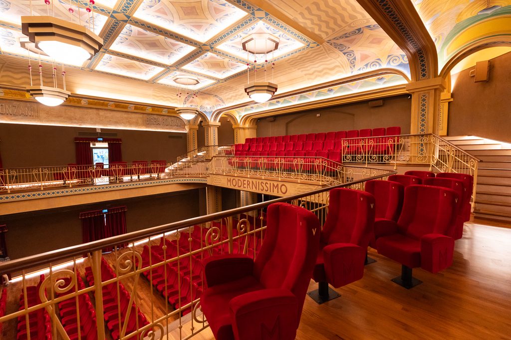 Situato nel suggestivo Palazzo Ronzani, simbolo di quella città che all’inizio del secolo scorso cambiò i suoi connotati votandosi alla modernità, il Modernissimo ha una lunga storia reincarnata nel recupero degli spazi affidato al grande scenografo Giancarlo Basili (suo il set de L’Amica Geniale e molti altri successi) che ha saputo conservare il fascino dei primi del Novecento, tra nuove invenzioni e tracce del passato; con un binomio unico che unisce un’esperienza di visione garantita da un apparato tecnologico all’avanguardia in un ambiente che conserva l’atmosfera del passato.