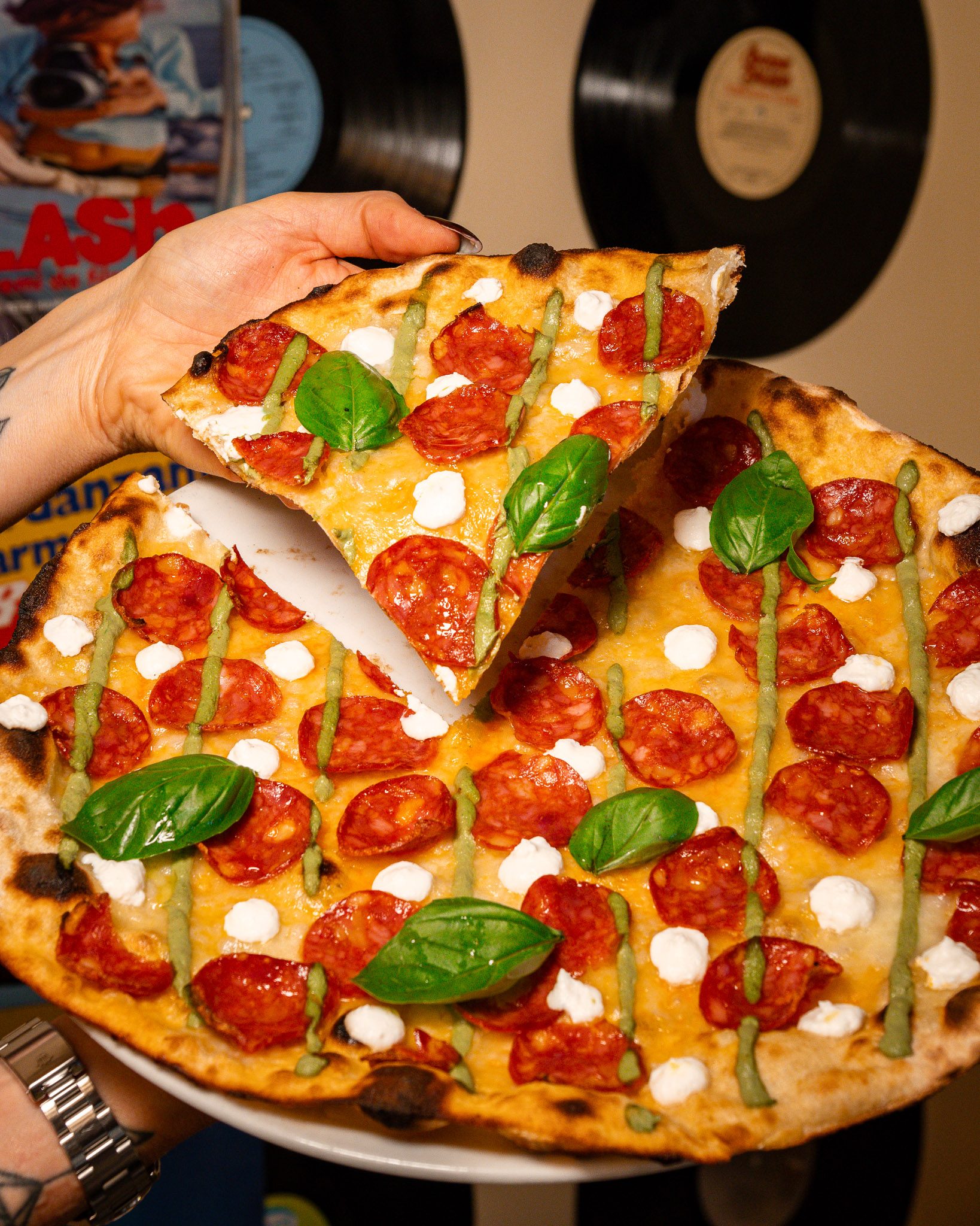 Se Milano avesse una macchina del tempo, Glory POP sarebbe il pulsante “anni ’80 e ’90”: neon rosa e blu, vinili sparsi, jukebox che sembra uscito da un film e poster d’epoca che ti fanno fare un remix mentale dei weekend spensierati. Aperta nel 2023 da Salvatore Venuto e soci, qui la pizza non è un piatto, è un’esperienza pop.