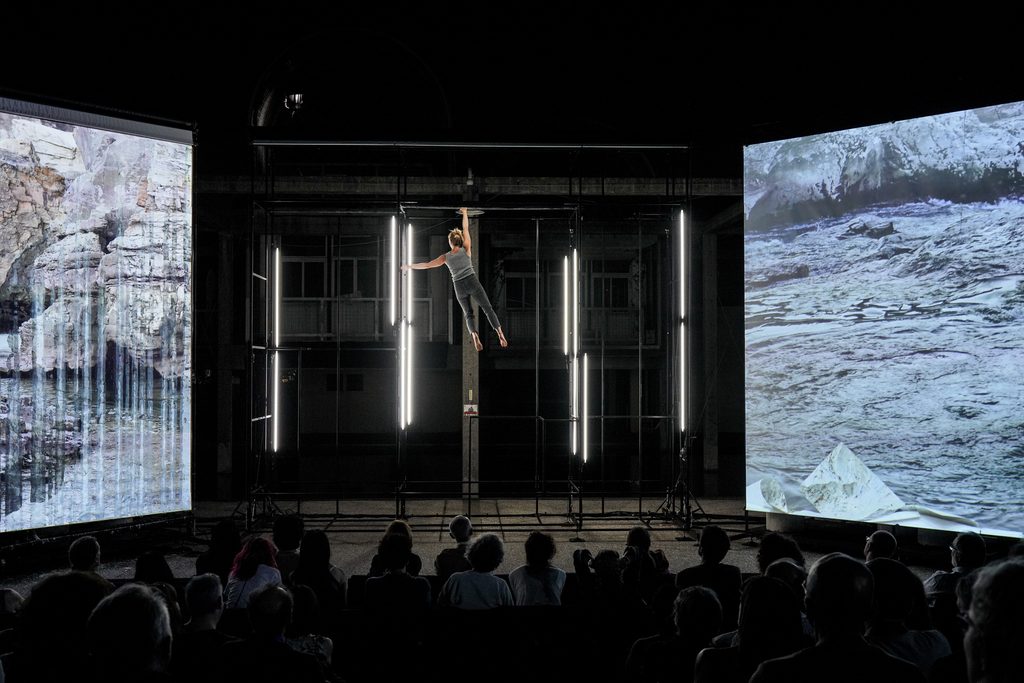 Il culmine di questa poetica dell’immagine arriva però con Anima di Noémie Goudal e Maëlle Poésy, per vederlo bisogna arrivare a Mestre nel Parco Bissuola, dove un grande palco è allestito con tre enormi schermi, come a raffigurare un trittico tipico dell’arte sacra del Medioevo. Immagini di palme che prendono fuoco si sovrappongono a rocce e ghiacciai che si sciolgono, in un’eterna trasformazione, dove c’è sempre qualcos’altro a prendere il posto di quello che c’era prima. Tutto, in questo caso, è metateatrale: le proiezioni stesse vengono costruite con pannelli stampati e ciò che sembra reale è invece una carta da parati proiettata che, alla fine, brucia…e cosa c’è dietro? Altra carta da parati e dietro ancora…altra carta e così via; in una sovrapposizione di strati, tutti filmati, che mostrano solo alla fine la struttura, finzionale, di un palcoscenico. Un’unica azione scenica, spettacolare, avviene verso la fine della performance, il pannello centrale si arrotola verso l’alto, mostrando l’ossatura metallica di un edificio brutalista, una carcassa in penombra. Chloé Moglia, performer, si arrampica sull’impalcatura e lentamente si appende in aria, sospesa, sfidando le leggi della gravità, del peso e, con leggerezza, compone una poesia di movimenti in contrasto con le immagini ai lati che continuano a trasformarsi.