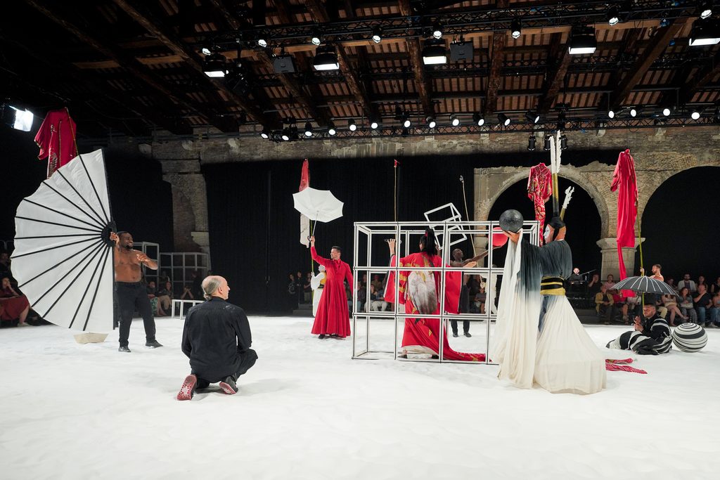 Un’immagine mi torna in mente ripensando a questa Biennale Teatro, ed è il palco del Teatro alle Tese cosparso, a terra, di sale bianco in occasione dello spettacolo Naturae di Armando Punzo, Leone d’Oro di questa edizione. Il pubblico, in doppia fila su tre lati del parallelepipedo del palco, è accecato dal biancore delle luci riflesse, in cui si muove Punzo con una palla rossa in mano che lo fa sembrare un burattinaio che tira le fila di tutti i suoi personaggi, ossia: la Compagnia della Fortezza. Gli attori sfilano con abiti fiabeschi e incantati tra parole poetiche e una musica minimalista lavora per addizione fino all’esplosione finale in una danza della vita. Perché questo è lo spettacolo, un eterno vorticare a tempo di valzer che supera i limiti di altezza, peso e fantasia creando immagini che si formano e disfano in continua trasformazione. «Qui non vedo confini, non è un mondo fuori dal mondo, ci vado a sognare sapendo di sognare» recita la voce fuori campo, e noi con loro sogniamo e seguiamo quest’esplosione di colori.