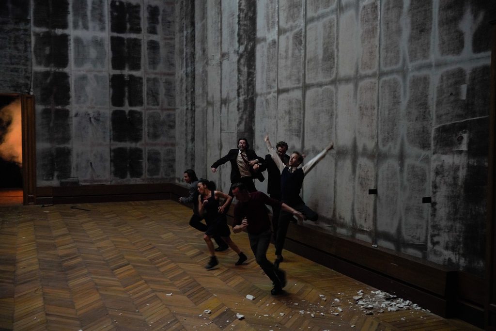 Anche gli FC Bergman sfidano i limiti dell’essere umano, fisici e mentali, nel loro spettacolo Het Land Nod, in scena a Marghera, in un enorme capannone allestito a teatro. Fuori dalla sala Rubens del Museo Reale di Belle Arti di Anversa si rovescia un temporale estivo, dentro suona Summertime e si susseguono scene surreali. Noi spettatori osserviamo una sala dove i quadri vengono rubati, i controllori distratti e rassegnati lasciano che visitatori disparati trattino il museo come se fosse casa, parco, toilette, dormitorio e molto altro. Le scene si susseguono e tra il comico e il tragico siamo trasportati in un film di Godard dove, come in Band à part, i protagonisti corrono nel Louvre – qui sala Rubens – in un atto liberatorio che vorremmo non finisse mai. Immagini (anche in questo caso) che si sovrappongono come fotografie di un album da sfogliare, appaiono sul palco: la carta dei tarocchi dell’appeso, la Morte di Marat, una famosa scena di cadute di Pina Bausch, l’eterno rincorrersi di Willy il coyote e Beep Beep, con la differenza che qui qualcosa esplode. La porta del museo è disintegrata per poter rubare i quadri e rimane solo una luce che mostra le impronte dei dipinti mancanti e la desolazione di un’arte che non c’è più. Nuovamente è confermata l’idea che questa Biennale si nutre di performance che non usano le parole, ma corpi, video e suoni per, alla fine, raccontare storie.