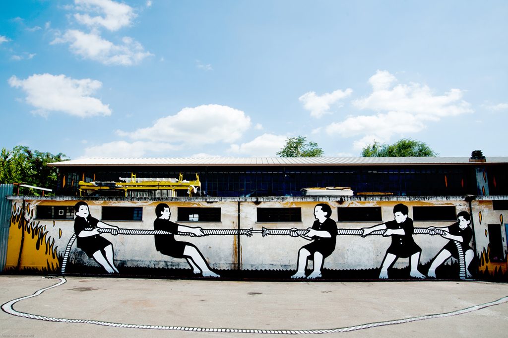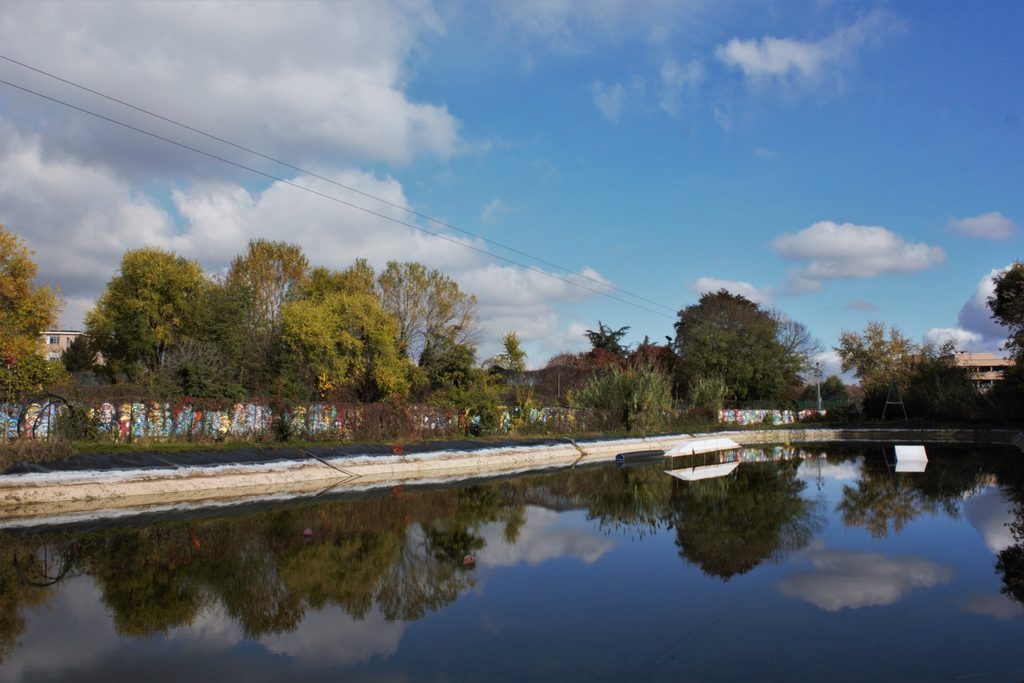 Infine nell’estate 2012, URBE si muove verso il confine tra Barriera di Milano e l’antico Scalo delle merci di Vanchiglia, dove ci sono praterie industriali abbandonate come l’antico mollificio vicino a un rifugio della Seconda Guerra Mondiale. Il bunker sotterraneo è immediatamente occupato per una perfomance di giochi di luce dell’artista Garu Garu. URBE incontra l’architetto Bruno Mastropietro, proprietario degli spazi e nasce Bunker, una delle esperienze più significative di socialità, arte ed enterteinment dal basso nella Torino degli anni 2010. Lo spazio è un piccolo villaggio con 1700 mq di grandi hangar; il principale è trasformato in un acquario dove nuotano squali e creature immaginifiche, diventerà la grande agorà e l’immagine copertina. Nelle prime notti suonano i dOP, il trio elettronico francese tra gli show più richiesti nei club e festival d’Europa di quelle estati, e i Ninos du Brasil, arrivano subito a colorarlo street artist da Brasile, Belgio, Germania, Olanda: Pixel Pancho disegna un grande gatto robot, Mattia Lullini colora le sue creature, MP5 immaginerà un tiro alla fune tra cinque persone alte come uno dei fabbricati. Intervengono agricoltori che coltivano una collina di orti dove crescono erbe, frutti e verdure post urbane. E sulla stessa collina, gli ingegneri, coordinati da Francesco Fossati (uno dei fondatori di URBE e della nuova associazione Variante Bunker, scomparso troppo presto a novembre 2019) progettano un lago e uno skylift, che diventano il primo wake park di una città d’Europa. “Il Bunker si ispira al modello dei community hub del Nord Europa, un’esperienza rara in Italia. L’esperimento, nato spontaneamente nella fabbrica di via Foggia, significa prendersi cura dello spazio, immaginandone il futuro valorizzando l’oggi, coinvolgendo le comunità metropolitane e dialogando con quelle di prossimità” racconta Giulia Marra, tra i fondatori di URBE-Rigenerazione Urbana, oggi dottoranda in Politiche Urbane al Politecnico di Milano.