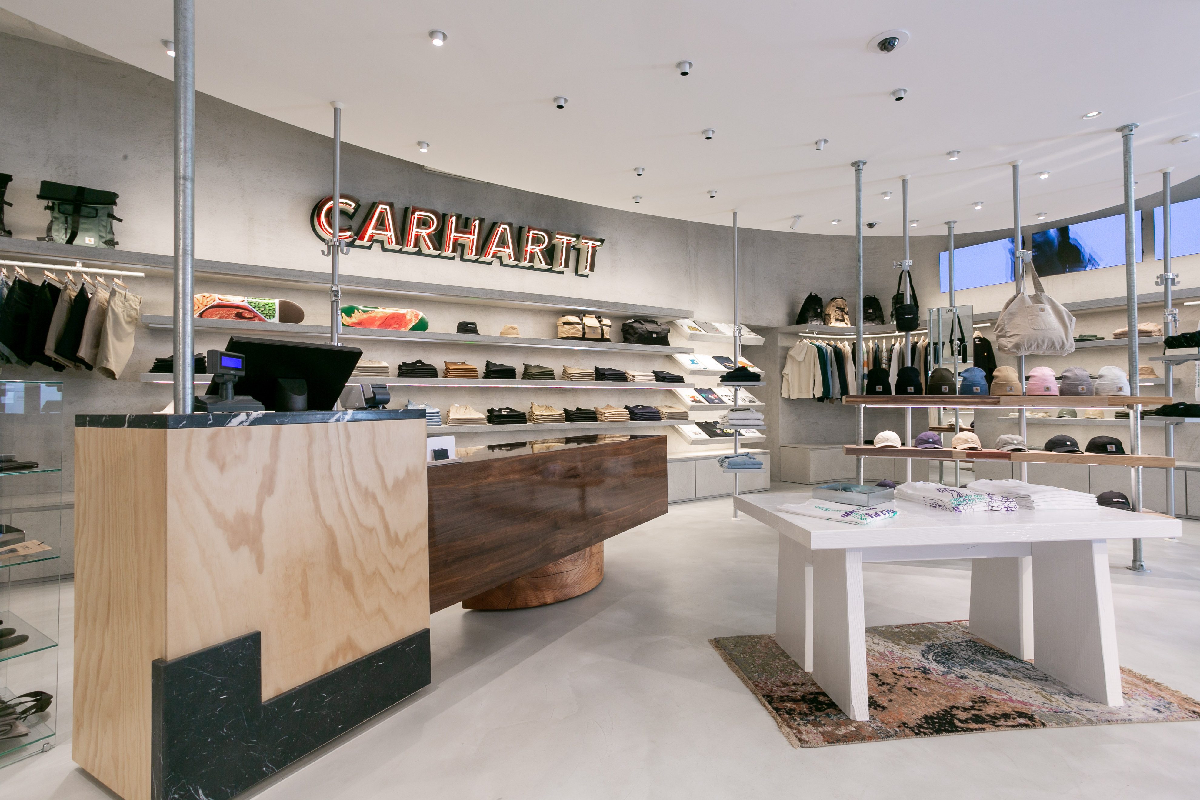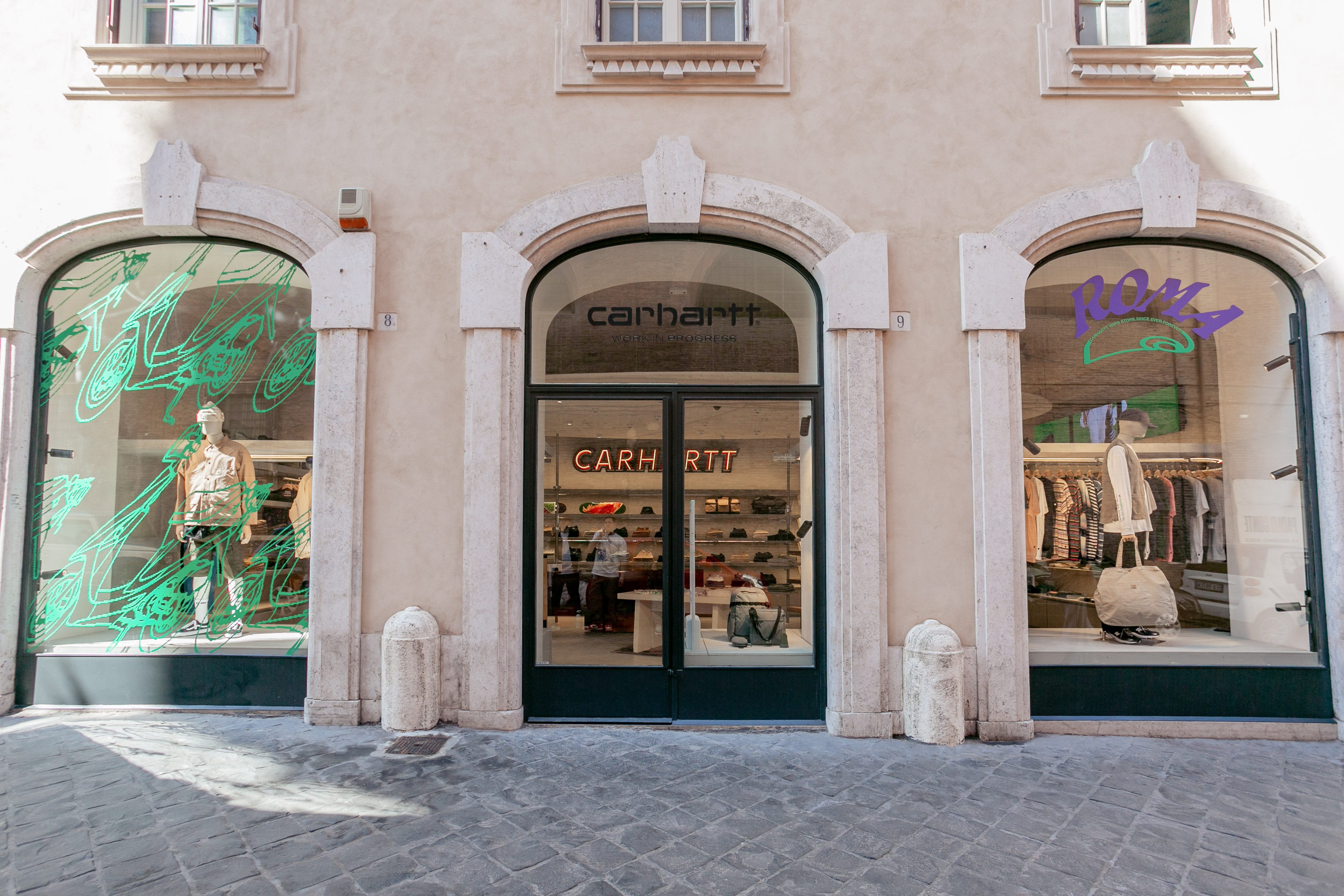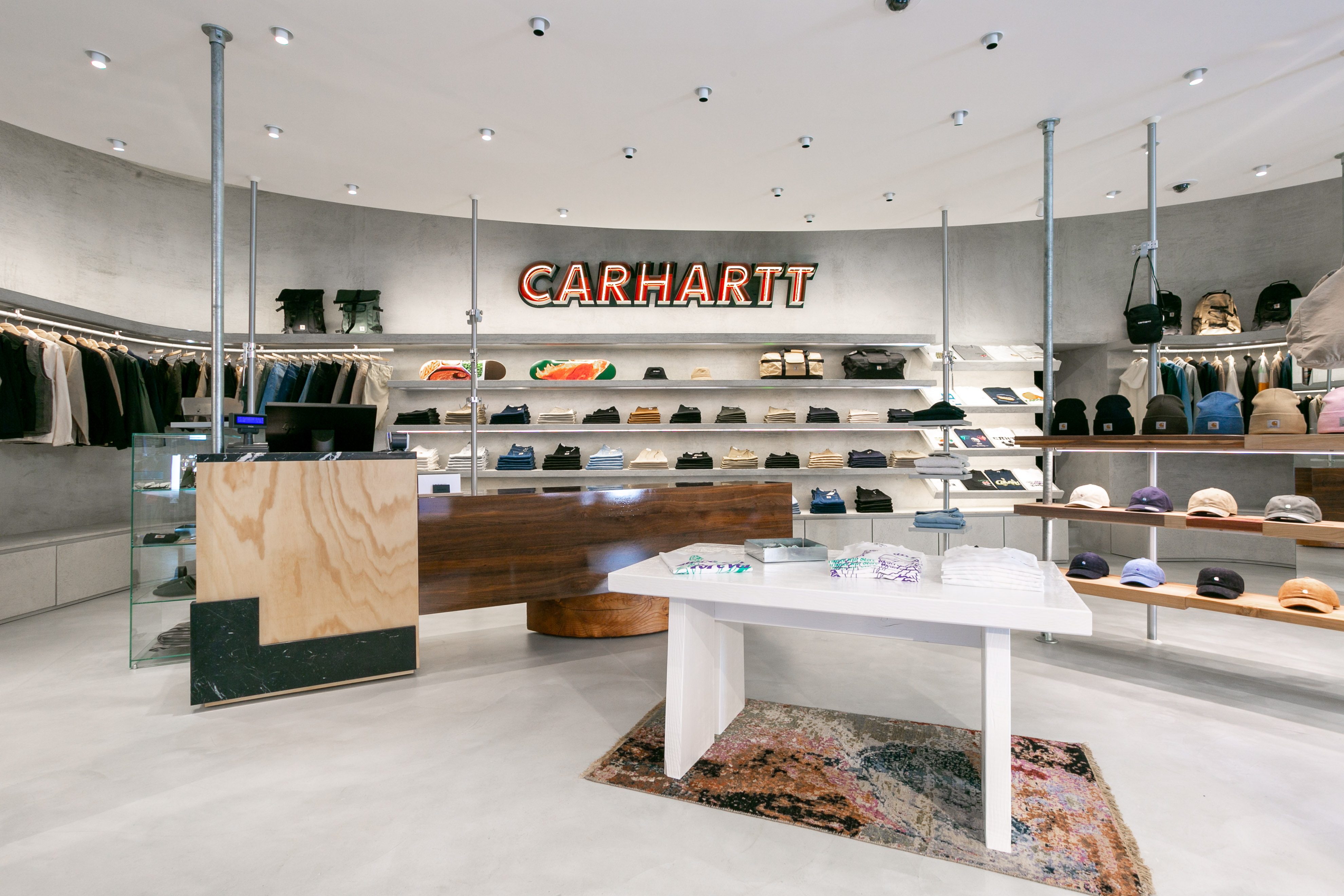 Il 29 aprile aprono al pubblico le porte del primo Carhartt WIP a Roma – il quinto in Italia – che si troverà in Via del Gambero 8, all’interno dello storico e settecentesco complesso di Palazzo Raggi che da un lato guarda a Via del Corso e al Parlamento, dall’altro a Via della Vite e Piazza di Spagna. Anche questo store è stato progettato dallo studio di architettura Andrea Caputo (Milano) che per i flagship Carhartt WIP ha scelto delle linee geometriche e minimali disegnate però attraverso l’utilizzo di materiali caldi. In particolare, lo store di Roma, di 75mq, sarà caratterizzato da un controsoffitto ellittico sospeso che funge da punto focale e dall’assenza di angoli, da cui deriva una sensazione di loop infinito che va dal pavimento al soffitto, sottolineata anche dall’uso di superfici in cemento neutro.