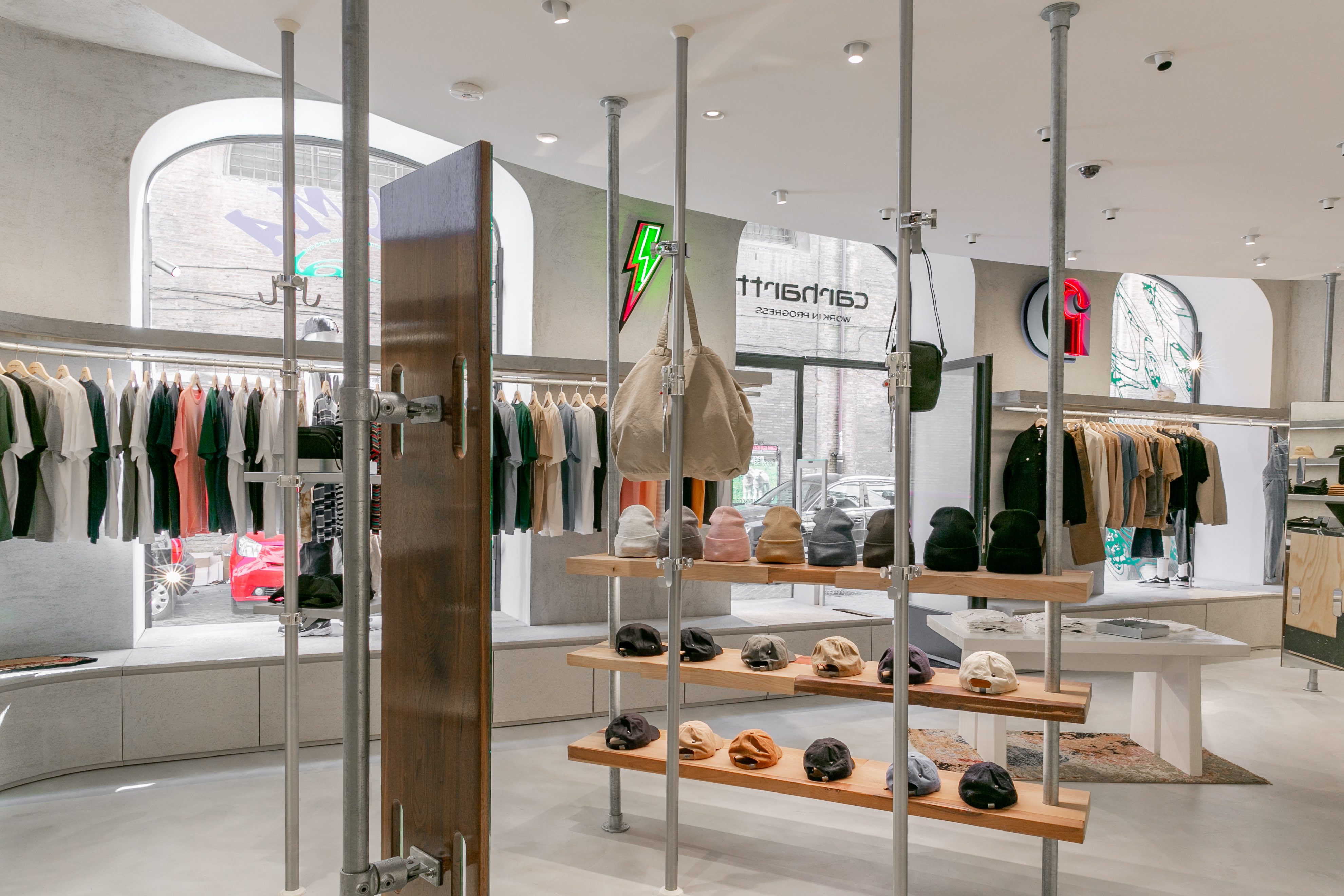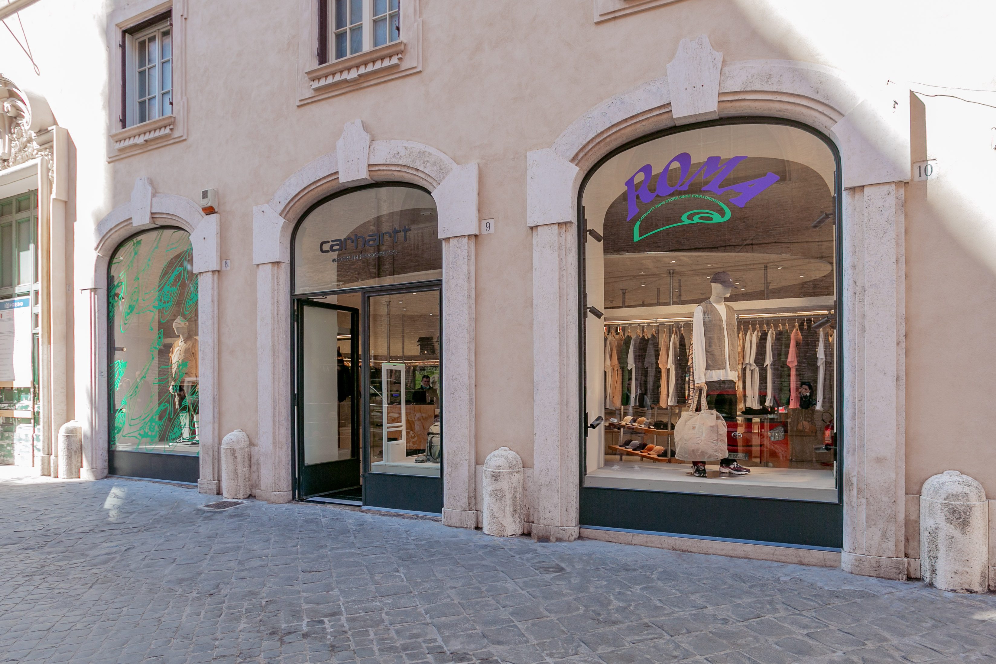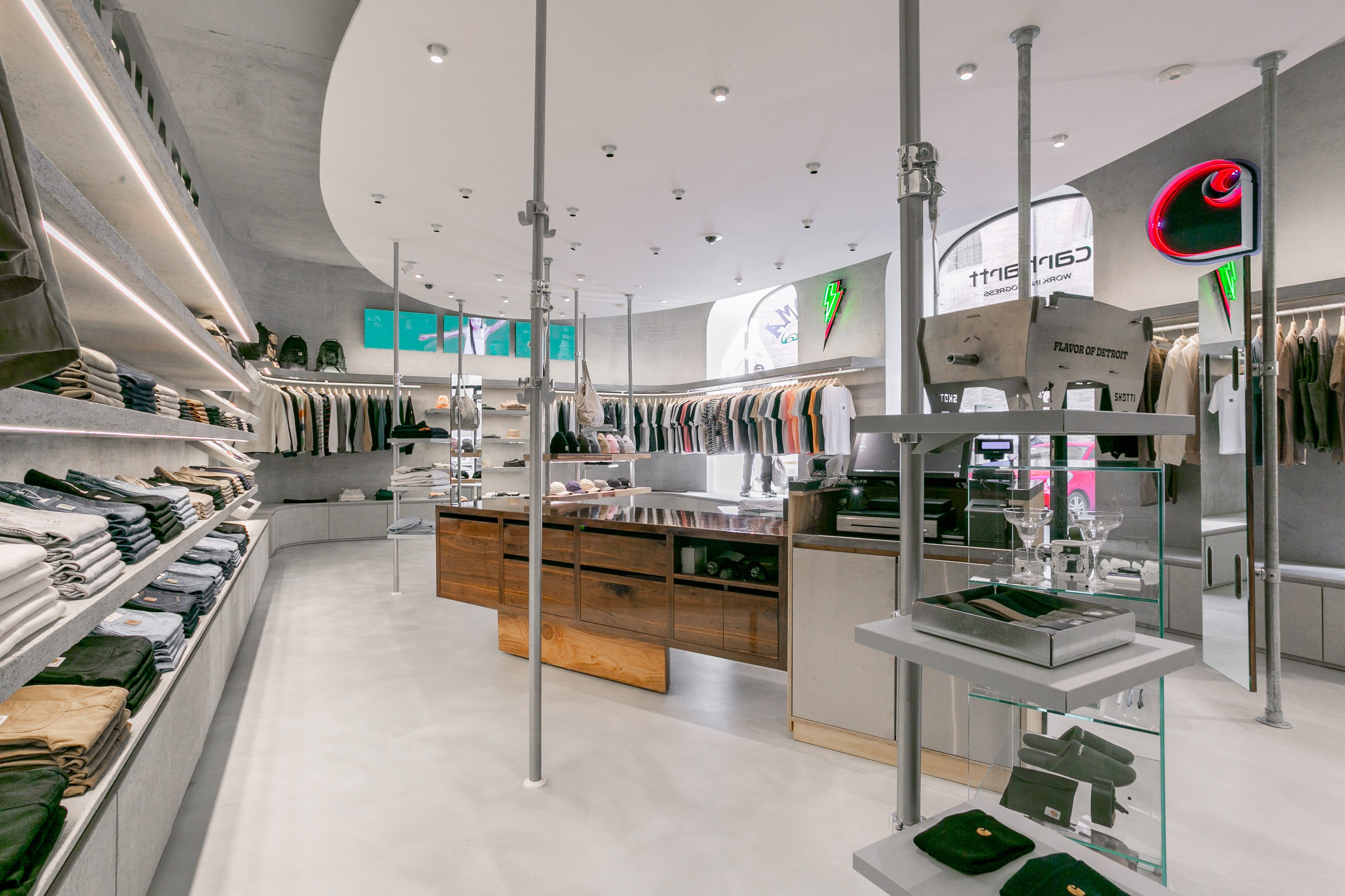 Il 29 aprile aprono al pubblico le porte del primo Carhartt WIP a Roma – il quinto in Italia – che si troverà in Via del Gambero 8, all’interno dello storico e settecentesco complesso di Palazzo Raggi che da un lato guarda a Via del Corso e al Parlamento, dall’altro a Via della Vite e Piazza di Spagna. Anche questo store è stato progettato dallo studio di architettura Andrea Caputo (Milano) che per i flagship Carhartt WIP ha scelto delle linee geometriche e minimali disegnate però attraverso l’utilizzo di materiali caldi. In particolare, lo store di Roma, di 75mq, sarà caratterizzato da un controsoffitto ellittico sospeso che funge da punto focale e dall’assenza di angoli, da cui deriva una sensazione di loop infinito che va dal pavimento al soffitto, sottolineata anche dall’uso di superfici in cemento neutro.