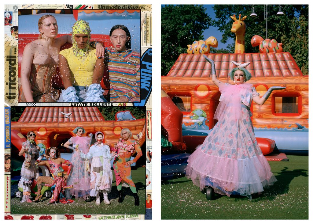 Insomma, l’intenzione politica è chiara da subito: portare la scena queer al confronto con quell’italianità e convincerla a divertirsi. Non per niente, in apertura, si legge una cosa bizzarra, che è interessante perché poco sentita: “decolonizzare l’italianità”. Un portare quel carattere sornione e da commensali, quella provincialità che in fondo è croce e delizia dell’Italia, a travestirsi e scoprirsi altra: cittadina, festaiola, magica, improbabile. Una specie di provincializzazione della cultura che attinge ai temi militanti di oggi e li mescola alle “tradizioni”, cercando di spogliarle da quel sapore “esotico” – gli “archeologi” creativi che ci siamo portati appresso per decenni – e dal conservatorismo retrò, il tutto “travestendo” questi temi e facendoli ballare tra gonfiabili, maschere e coriandoli.