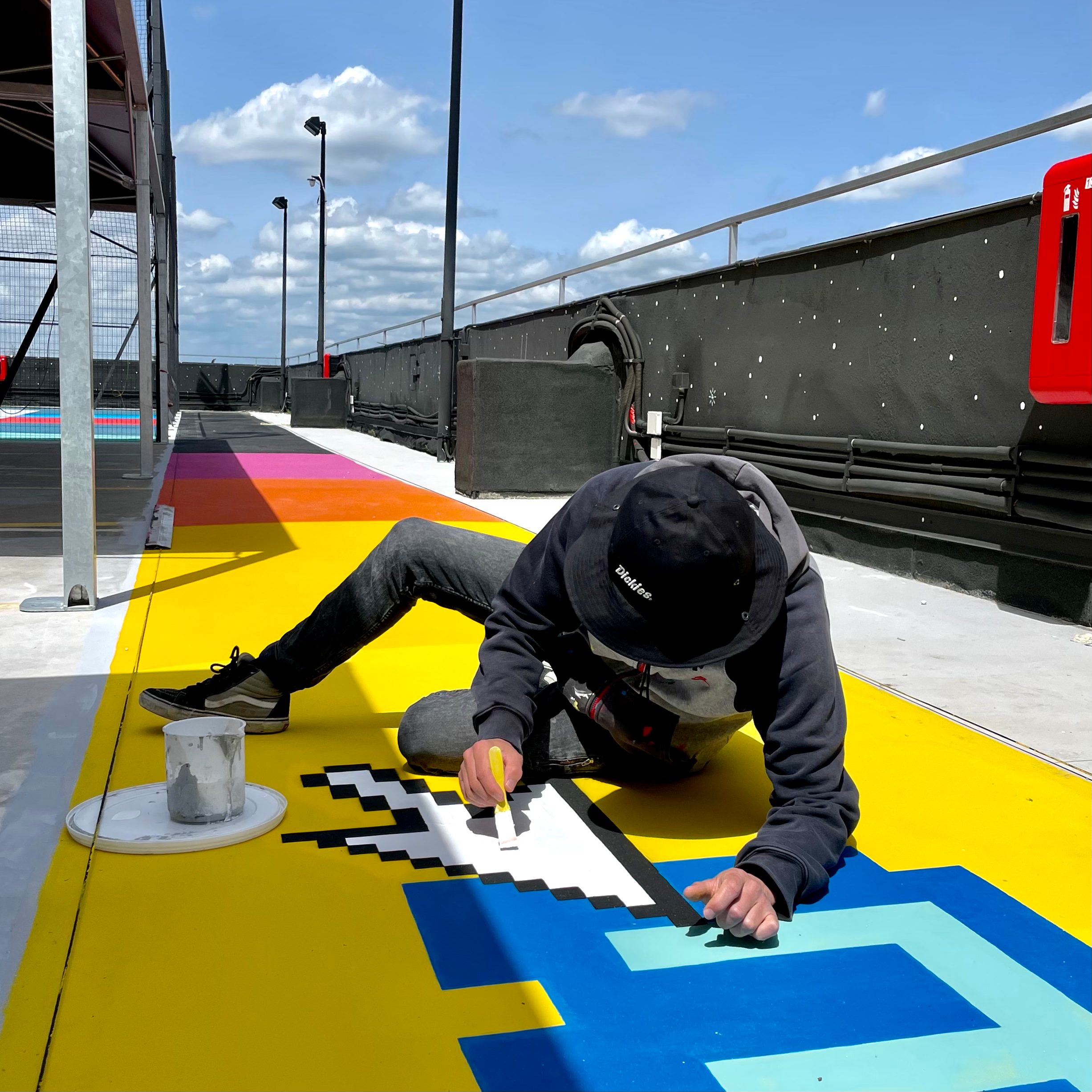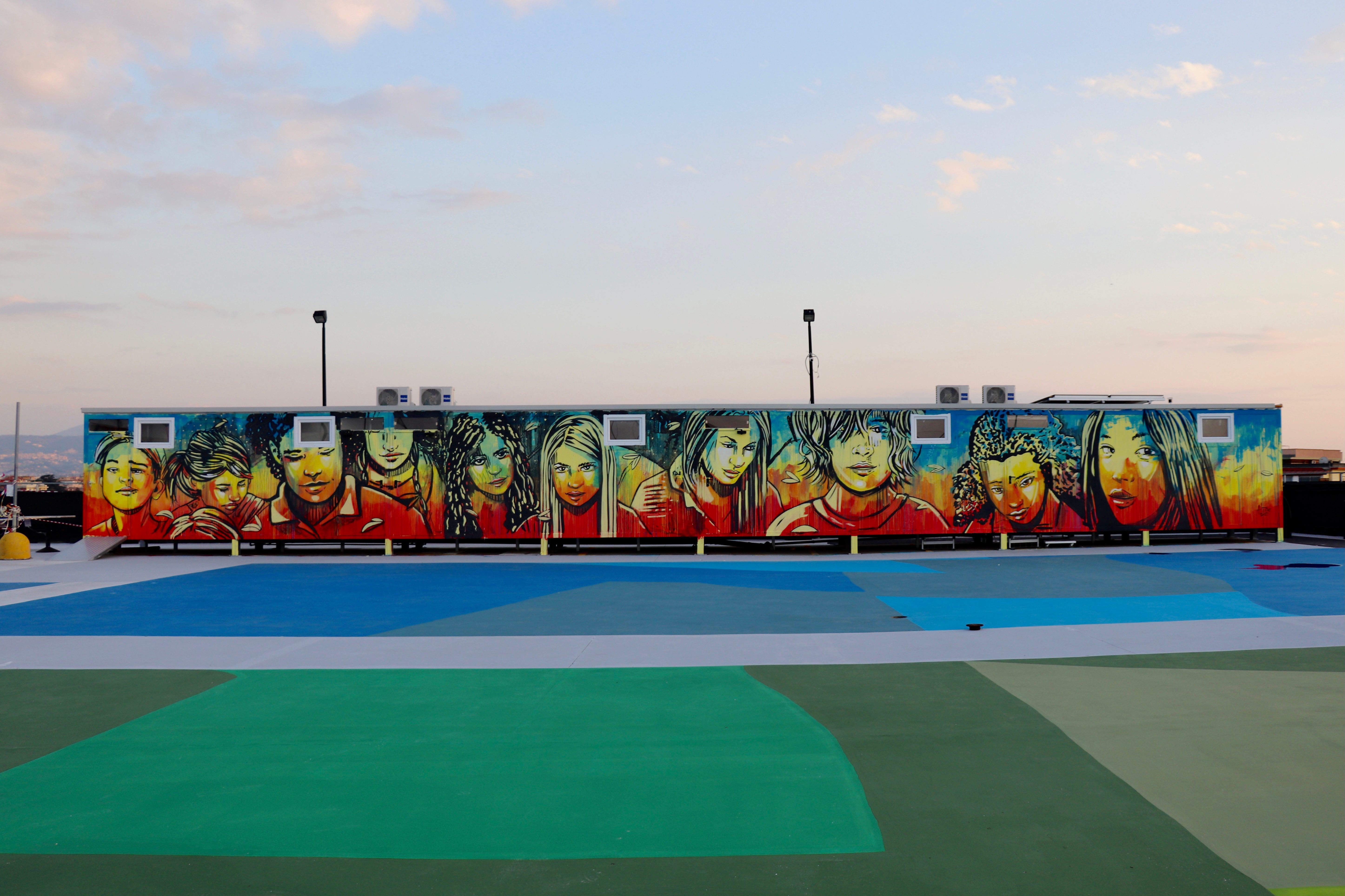Questo il cibo per il corpo. Alla mente – soprattutto agli occhi – ci hanno pensato a.DNA e il curatore Mirko Pierri, che ha chiamato tre protagonisti di peso della street e dell’arte pubblica: Alice Pasquini, che ha firmato le superfici verticali, Giulio Vesprini e Uno, che hanno dipinto i campi da gioco e il tracciato panoramico perimetrale. Le pareti verticali, inoltre, sono state dipinte con Airlite, tecnologia che si applica come una pittura e che contribuisce a purificare l’aria.