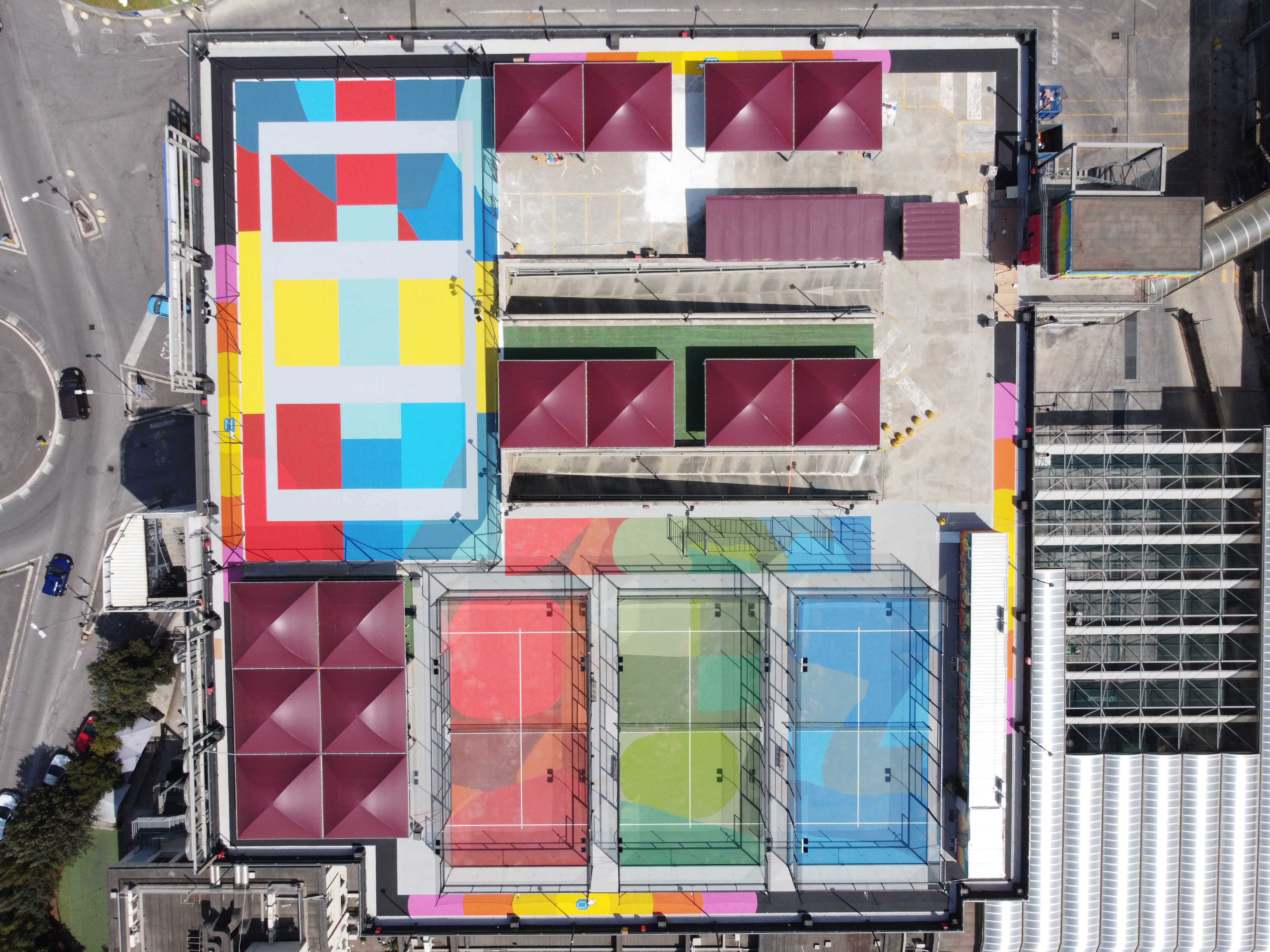 Presentati e conosciuti i protagonisti, metteteli di fronte al tetto di un parcheggio (di fianco la sede del Fusolab) e dategli più o meno carta bianca. Il risultato è il Casilino Sky Park: uno spazio inedito per Roma (disegnato da Claudio Guerrieri), meravigliosamente colorato, dedicato allo sport, alla socialità e alla creatività. Il progetto, al quale hanno collaborato anche IGT, LifeGate e IGD, prevede campi sportivi per praticare padel, pickleball, calcetto, street basket, pattinaggio, skateboard e parkour, una palestra all’aperto, zone dedicate alla ginnastica a corpo libero, crossfit e calisthenics, ai quali si aggiungono una zona bar, una zona coworking e una per i bambini.