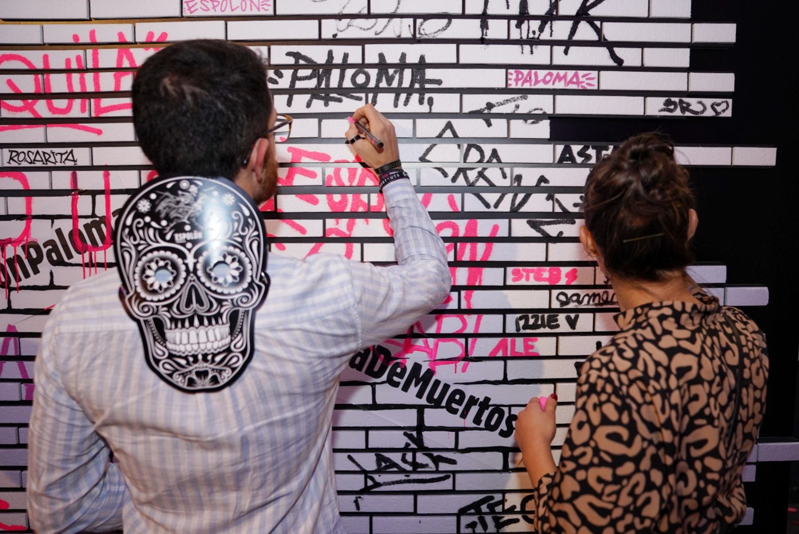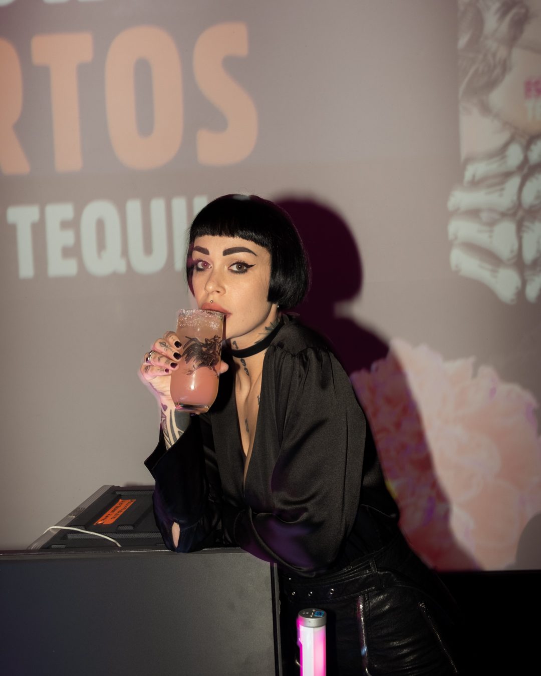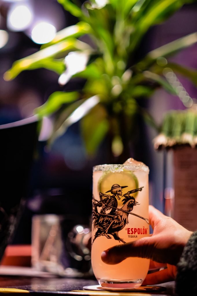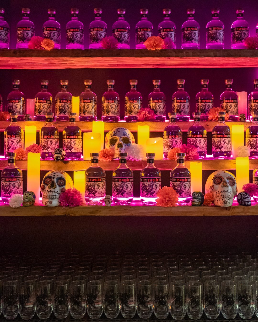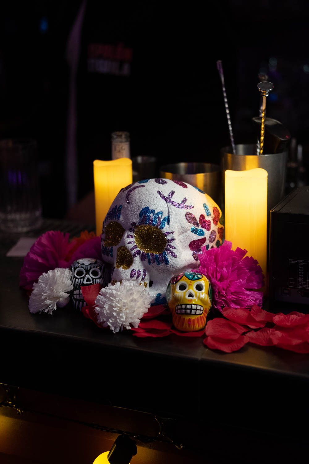 Ovviamente non mi sono fatta sfuggire nemmeno per un nanosecondo l’opportunità di partecipare a questo mix perfettamente equilibrato tra il distillato dei sogni e un’impalcatura sonora e visiva di visioni estatiche. Per l’occasione mi sono fatta accompagnare da un’amica di mille avventure che ha tequila sale&limone tatuato su una coscia (e non ha potuto dirmi di no). La mia sete inestinguibile di neon fucsia è stata soddisfatta sin da subito, già dall’attraversamento pedonale, da cui era possibile scorgere una trionfante Santeria in festa. Com’è che giusto che sia: le porte sono importanti. Una soglia, vera e propria, da varcare per mollare fuori l’umido, i lampioni, le macchine a noleggio, le mail, la cessione del quinto, le stampanti e far finta di essere qualcun altro più vero e più simile a noi (che è anche uno dei super poteri dei bar di tutto il mondo). Da ignorante in materia, ho scoperto grazie a questa atmosfera calda e frizzante che la festa dei morti messicana si esprime con simboli lampanti che raccontano la cultura di un popolo incredibile per celebrare la morte godendo la vita. Il nome Espolón Tequila è già un simbolo esso stesso: vuol dire “lo sperone”, l’ arnese legato alla zampetta del gallo da combattimento, che ne rievoca anche il logo, il gallo che è orgoglio e simbolo nazionale del Messico.
