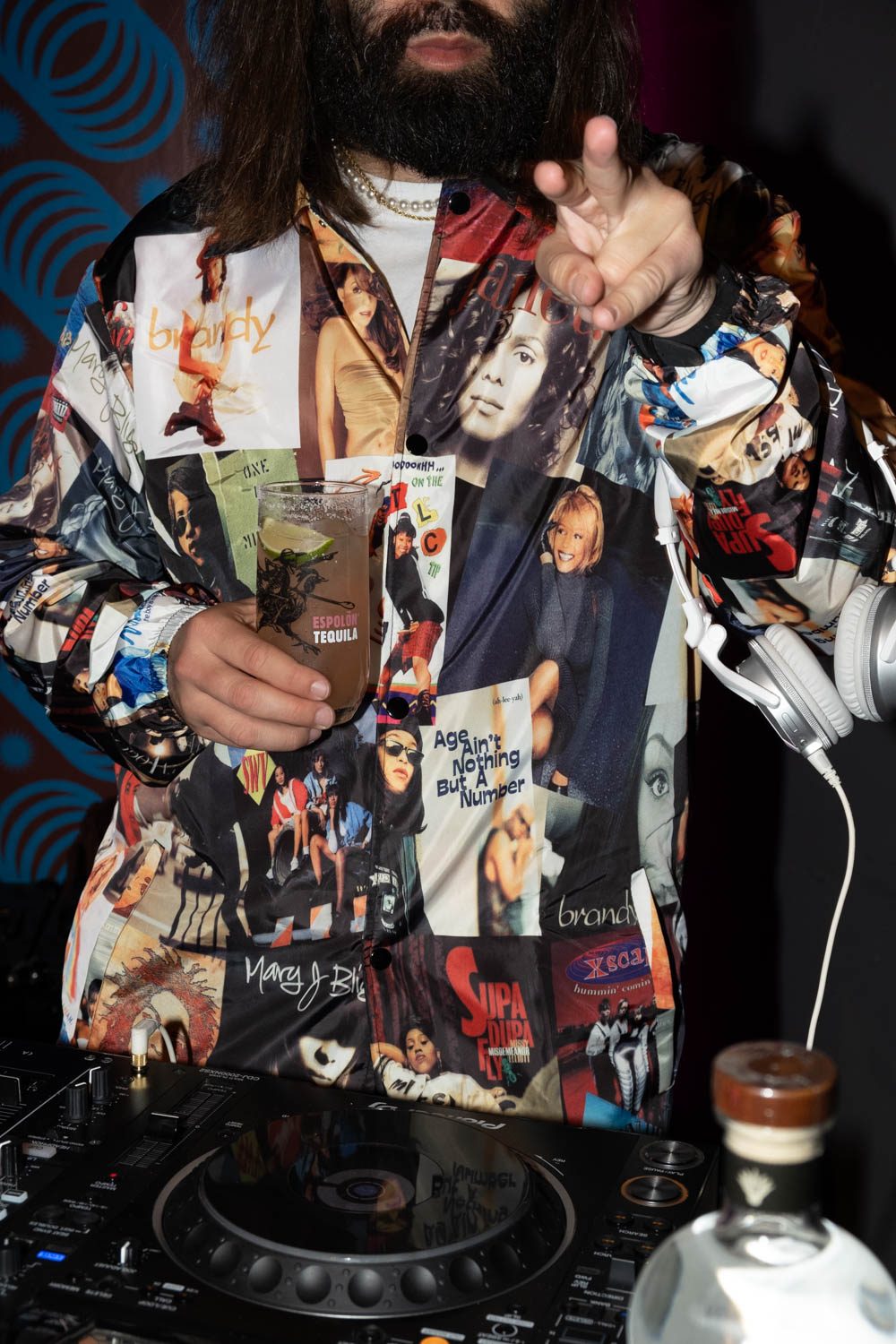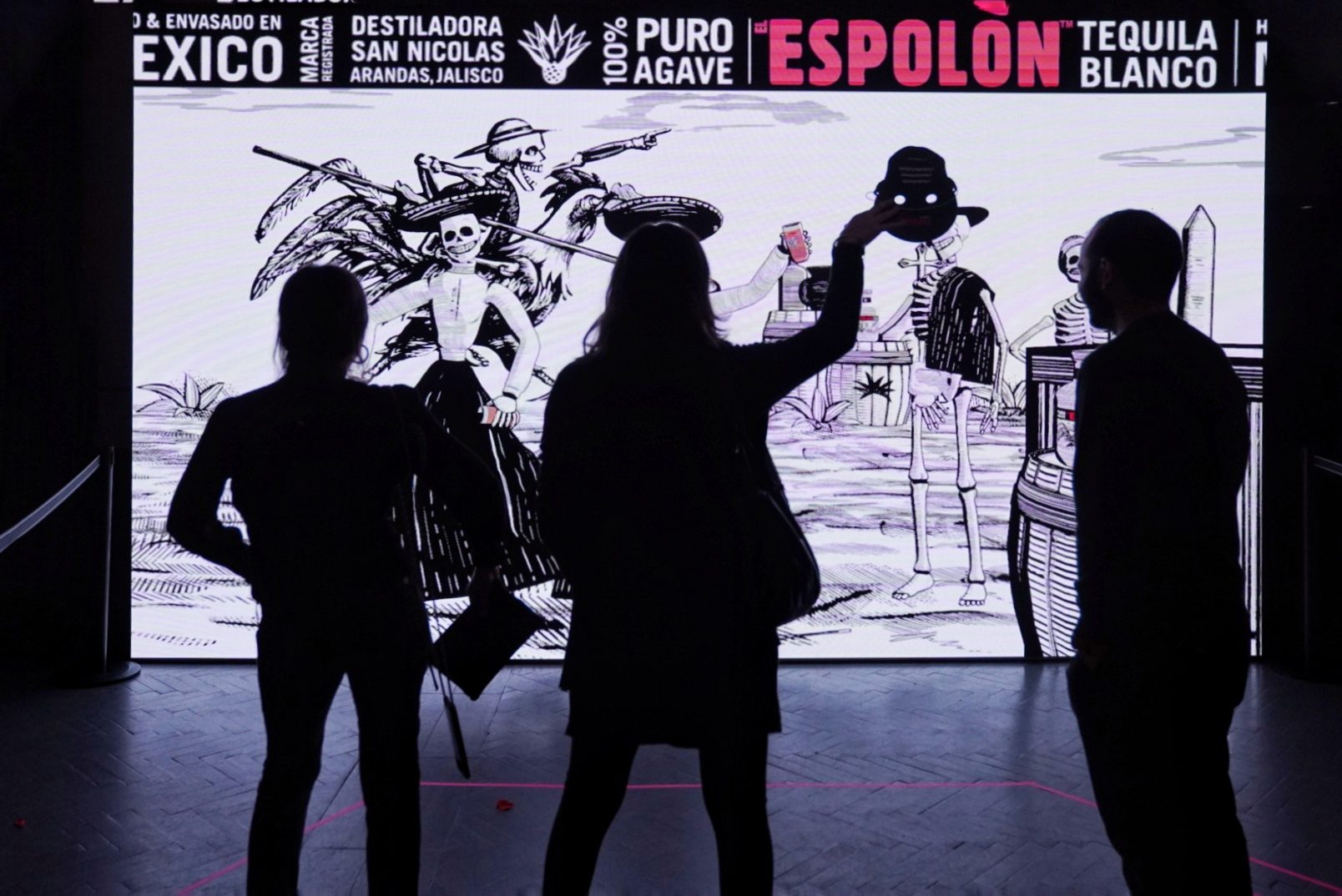 Ovviamente il pubblico è quello figo delle grandi occasioni, pullulano facce conosciute dell’underground milanese e non solo di quelli che fanno le cose fighe. Tutto si riallinea, funziona, fa clic: la musica c’è, Sgamo suona benissimo con la giacca a vento pazzesca, l’atmosfera è quella delle serate belle. Pensato per l’occasione c’è un photoboot interattivo con tecnologia Kinect che balla con te, con due dei soliti iconici teschi messicani che seguono i movimenti di chi balla davanti al monitor. Anche sul mio splendido bicchiere, in coordinato con le illustrazioni in movimento, campeggia l’effige di Guadalupe che guida la rivoluzione in sella al Gallo Ramon, enorme bellissimo e fiero.