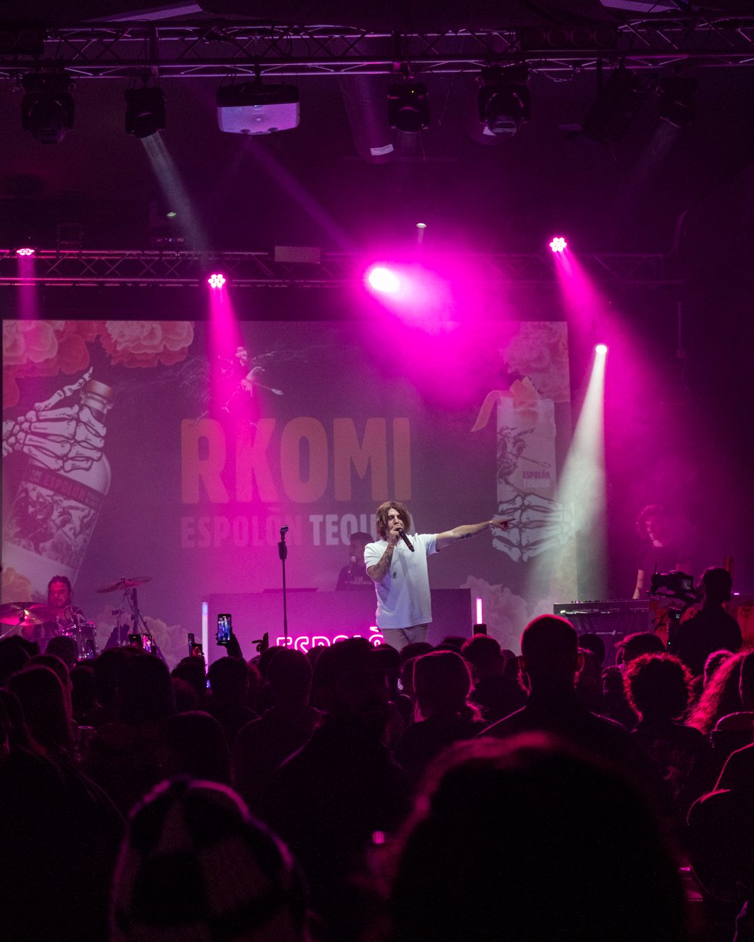 Una ragazza addobbata con con gli abiti tradizionali ed il volto dipinto secondo la tradizione mi si avvicina e mi chiede se voglio farmi leggere le carte dall’Oracolo. Mi diverto a spiare i più coraggiosi di me che approfittano entusiasti di questa opportunità rara. Questo primo ambiente accogliente, è in coordinato ma in contrasto con la seconda area, quella ispirata al Mitclàn. Nella sala concerti di Santeria (e che ricordi qui) c’è un dispiego di colori, luci, proiezioni immersive e i miei adorati immancabili neon fucsia. L’aria che tira è quella che porta odore di nuovo, c’è una forza attrattiva verso tutto quello che vedo qui. Un po’ come dire ok ci siamo di-vertiti, onoriamo il passato che ci ha portato qui e adesso facciamo – anche – come diciamo noi. Un inno alla vita: i dj-set fanno brillare l’aria, Rkomi infiamma il pubblico, che si muove finalmente come un organismo unico, enorme, pieno di forza. Il collettivo Gh00st usa il teschio come matrice per creare uno schema nuovo insolito per un pattern colorato, sprayando accanto al palco in una spe-cie di live performance pittorica.