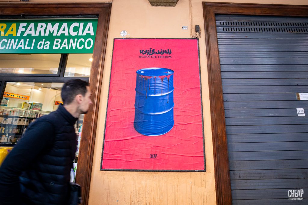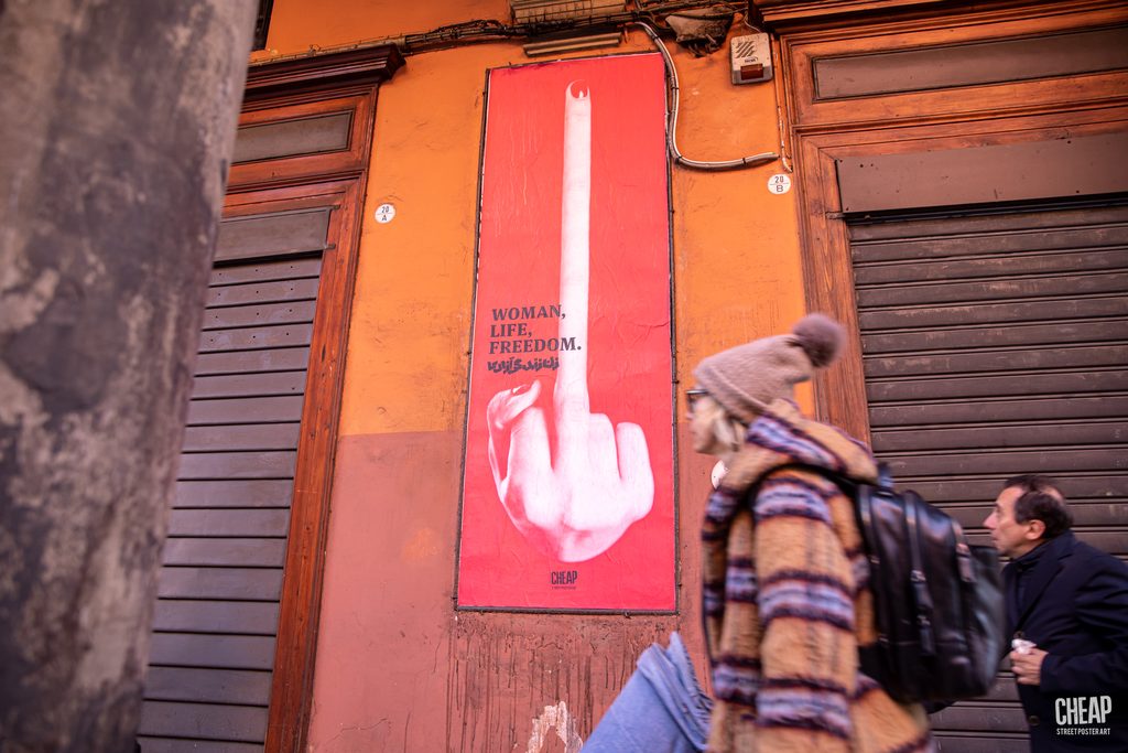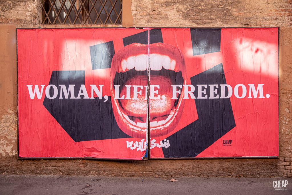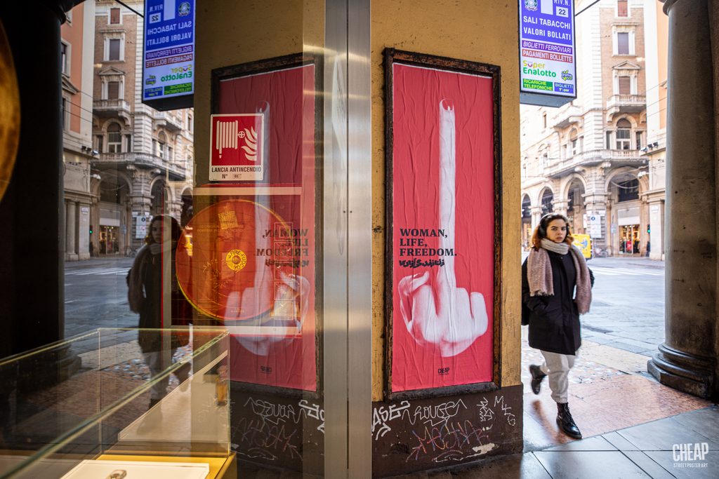 AIA – Anonymous Iranian Artists è un collettivo operante in tutto il mondo che opera nell’anonimato. Le loro fotografie rivisitate compongono oggi le nuove affissioni di CHEAP raccolte attorno allo slogan Donna, Vita, Libertà in cui si riconoscono anche le proteste in Iran e le richieste perentorie di diritti e laicità.