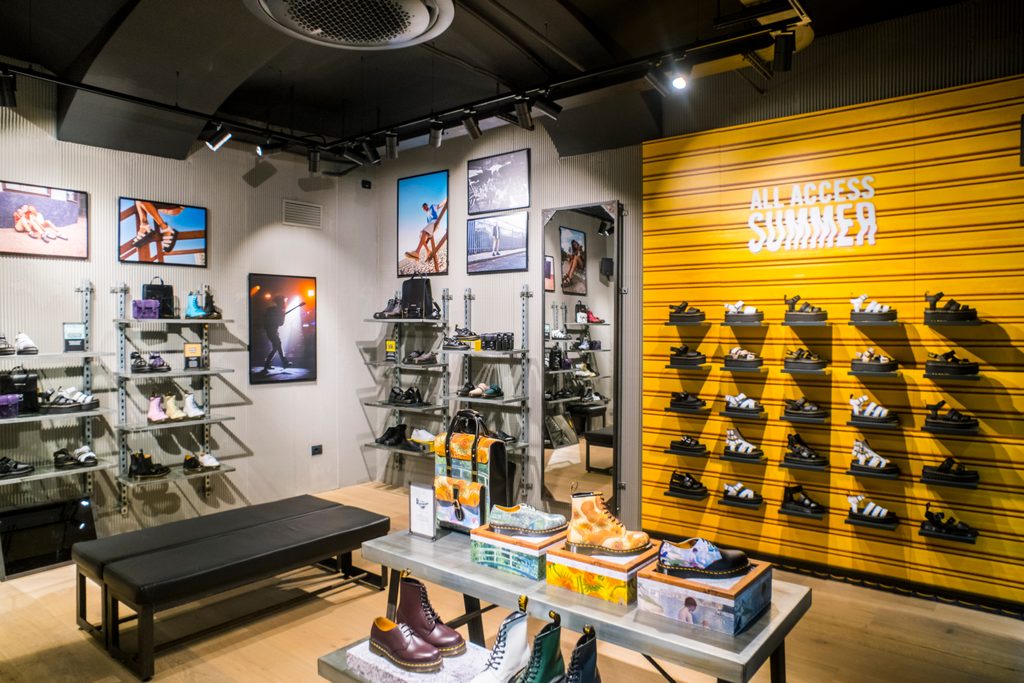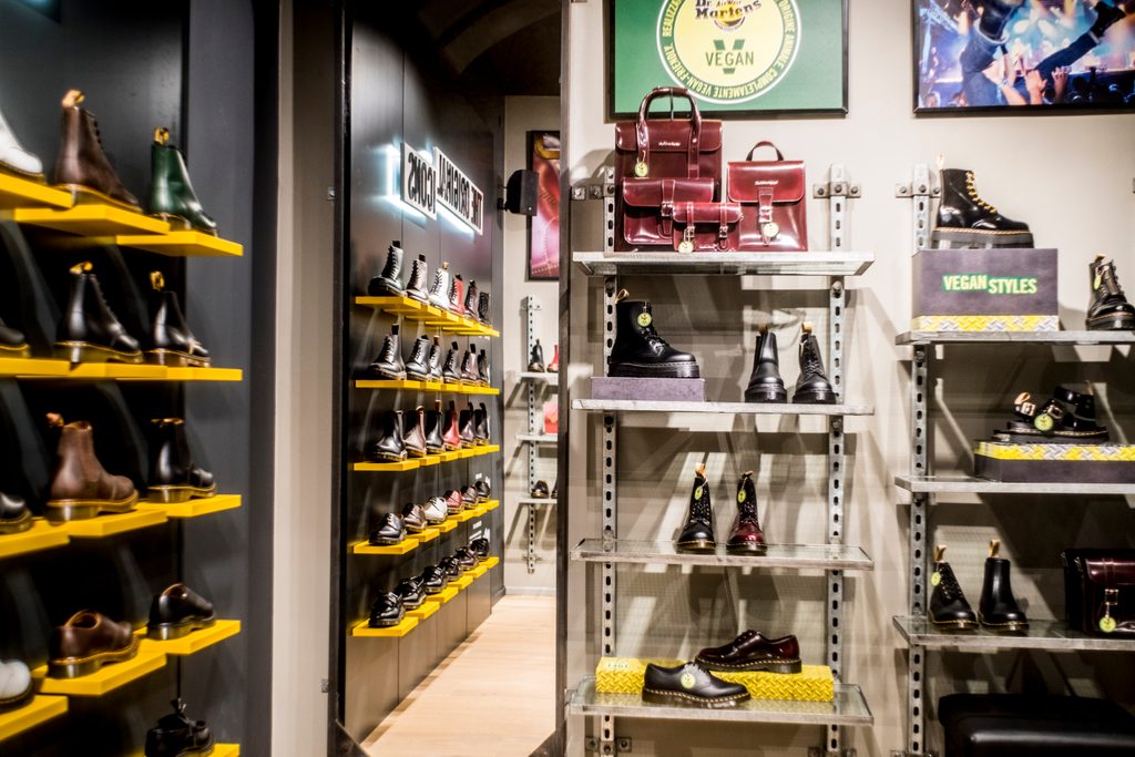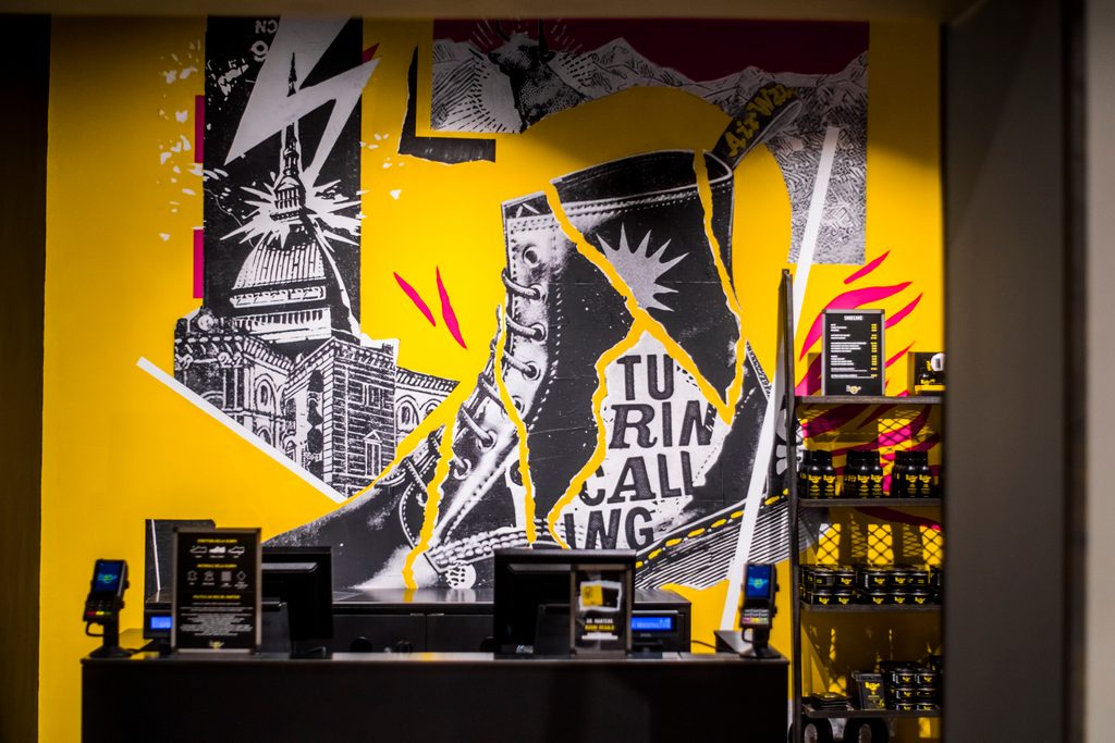 Li ha immaginati Matteo Cozzo, un artista del collage che ha unito i due simboli più iconici, la mole e la scarpa, attraverso uno strappo sui muri del nuovissimo store Dr.Martens in via Garibaldi. Un intreccio di creste e bordi frastagliati, segni della ribellione, che legano i punk, i mod, i metallari, gli ultrà e quelle comunità del sottosuolo, che a Torino si sono riprodotte nei tanti sentieri e impulsi di una città con il pensiero laterale storicamente sviluppato e che, per un motivo o per l’altro, viaggiano con i Dr. Martens ai piedi. E Via Garibaldi la conoscono tutti: collega il giardino dedicato al maestro Ezio Bosso in piazza Statuto con il suo popolo di mod, a Piazza Castello, il bordo dei Palazzi Reali e il giardino del Re. Tra questi due punti cardine si apre la prospettiva che Alice Lotti ha disegnato per la Dr. Martens District Guide Torino Edition, la guida tra la città dei quartieri torinesi e il grande mercato di Porta Palazzo. Piole, vino, libri e i tanti colori di tutte le differenze che vivono tra le strade antiche, delineando una città contemporanea, multi diversa, chic e dissidente. Oltre via Garibaldi, in Piazza Castello, c’è il Teatro Regio delle opere e delle liriche disegnato da quel punk di Carlo Mollino, che poi è sempre stato anche la residenza dello spakkio, i breaker, gli skater, i writer, come Venice Beach in Piazza Italia.