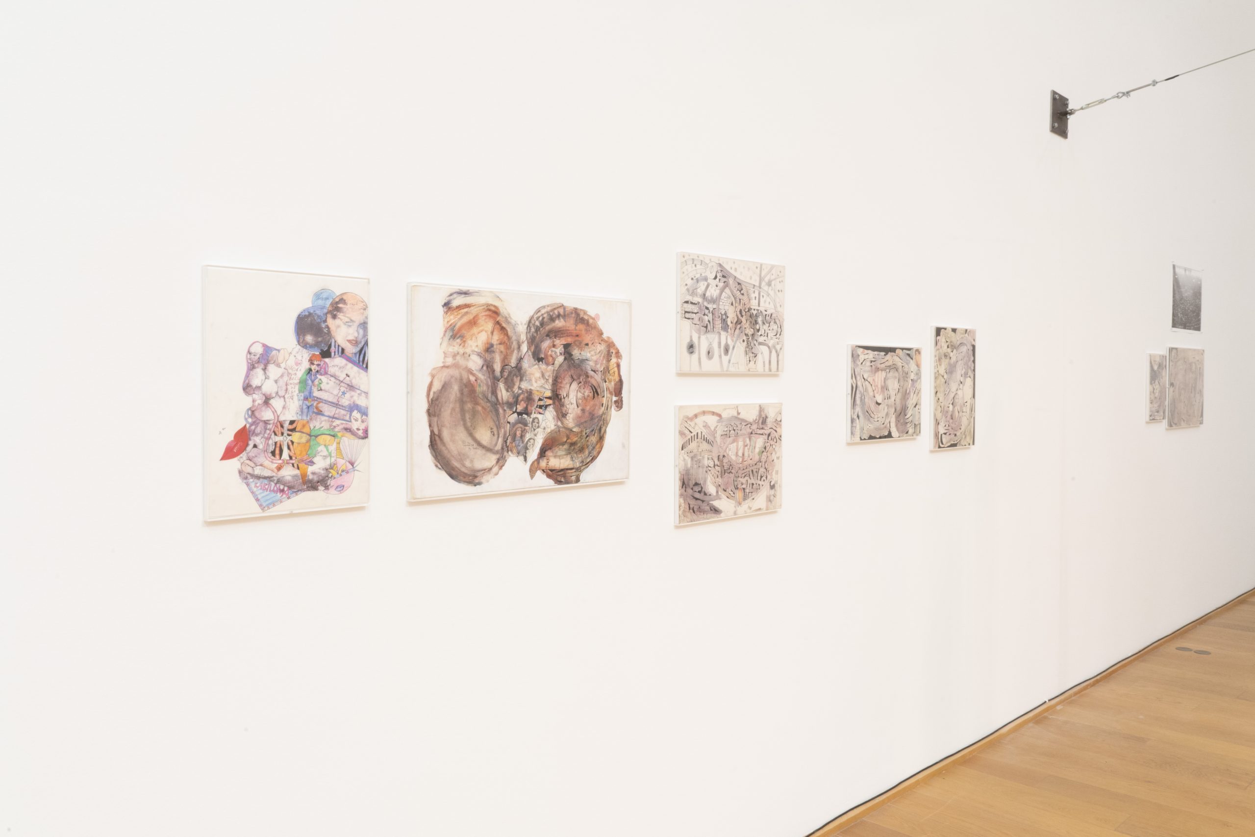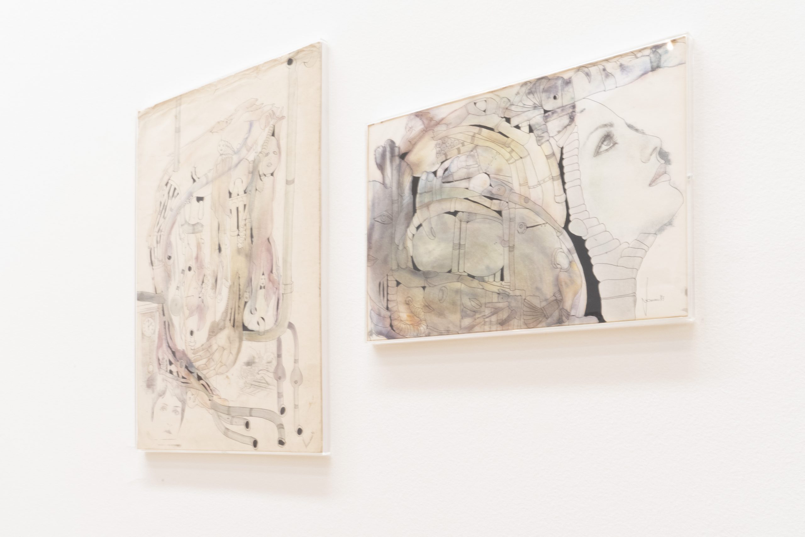 Parte così una produzione intensissima di disegni pischedelici, acquerelli e collage in cui gli immaginari di un’intera generazione prendono la forma di surreali paesaggi meccanici e formazioni stratificate in cui corpi alieni, mani e labbra, seni, vagine, falli e tubi si fondono l’uno nell’altro.