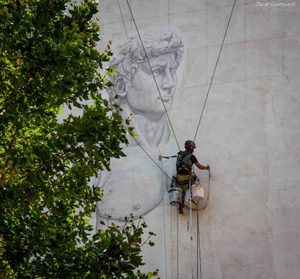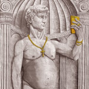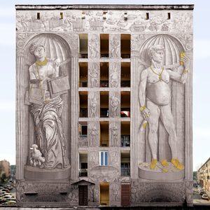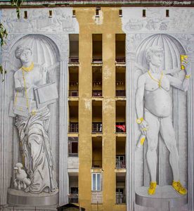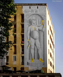 Un’opera bellissima, in cui ritornano i temi che più gli stanno a cuore: il consumismo, i rapporti di potere, i mali della contemporaneità. Da una parte una Venere di Milo iper griffata con barboncino accuratamente tolettato al seguito, dall’altra un coattissimo David di Michelangelo, panza in vista, Hogan ai piedi, croce d’oro al collo, birra in mano. Tutt’intorno i dannati di questo sistema che inizia nelle boutique e finisce altrove sui campi di guerra.