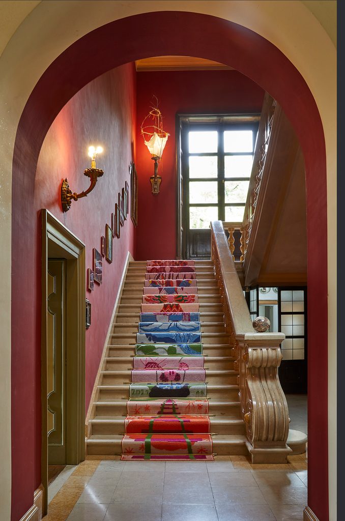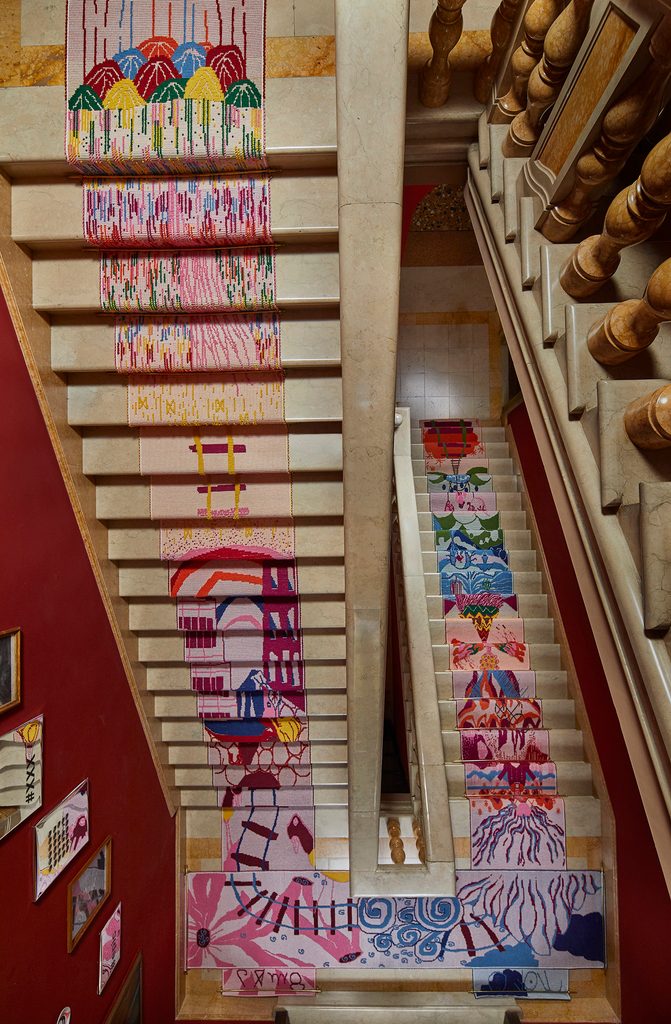 Negli anni le opere hanno modellato lo spazio, integrando storie e ricordi. Accumuli di materiali, sia trovati, riciclati, sia acquistati nei più improbabili posti. Glitter, tessuti, sticker, matasse, fili di lana, totem, libri, rami, fotografie, ritratti di avi alle pareti, la serie di opere in mylar di Daniel González, collezioni di lance o ceramiche, ricordi, cataloghi… Un macro-mondo stratificato da osservare con minuziosa cura, scovando pezzo per pezzo, traccia dopo traccia, per poi immaginarla nel suo insieme totalizzante. In questo modo si possono cogliere le diverse culture, estetiche e periodi che Galtarossa ha indagato e rielaborato. Come in un grande caleidoscopio, percorrendo tra i saloni, le stanze da letto, i salotti, i bagni, lo scalone costituito da diversi marmi provenienti dal Veneto, si incontrano “divinità domestiche”, eleganti tappeti e arazzi – corpi di lavoro frutto dell’ultimo periodo di ricerca di Anna – pon pon applicati su borsette della nonna, strati di materiali, elementi naturali come rami o piante, spille, gingilli, lane, cotoni e sete, e poi gli arazzi.