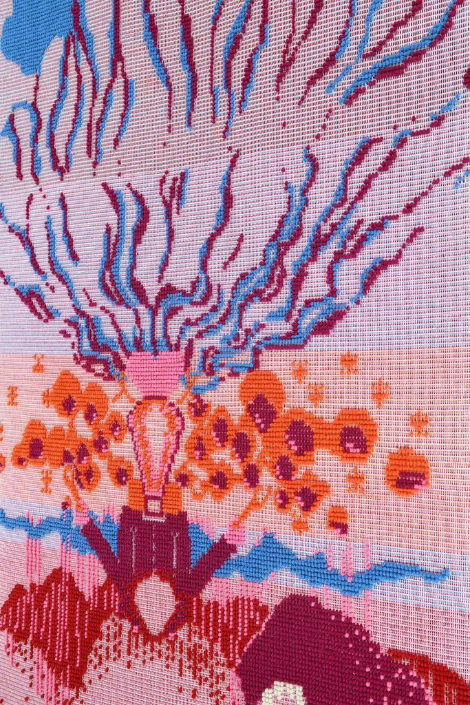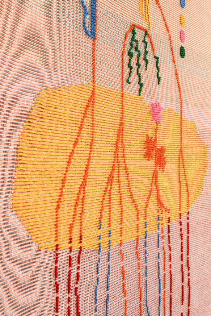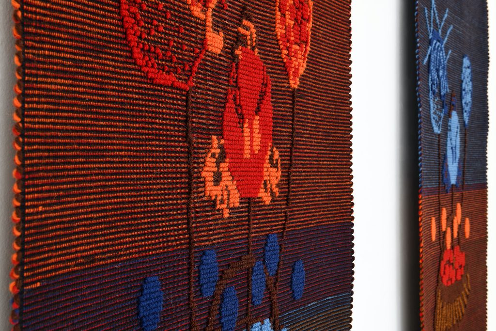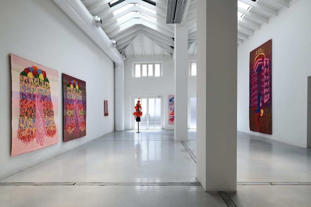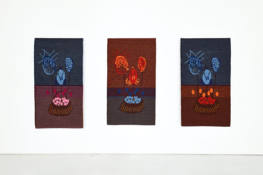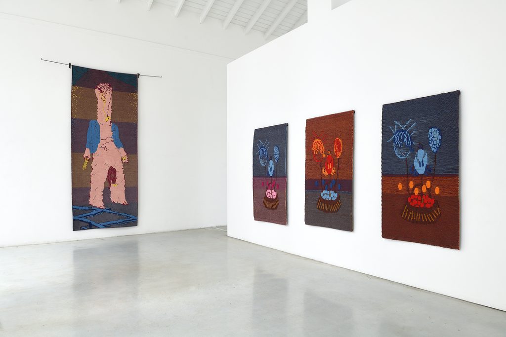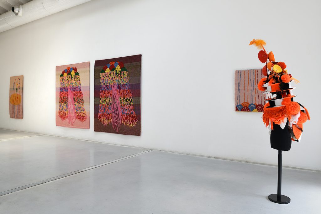Gli arazzi sono infatti dei grandi paesaggi, o ampie narrazioni, tridimensionali per via del tessuto minuziosamente elaborato, ma, appunto, grafiche nell’impatto estetico quasi all over. Arancioni mischiati ai bordeaux, i fucsia con i rossi, un cuore, una figura antropomorfa, un’altra vegetale. Gli stessi soggetti che appaiono nelle sculture più storiche di Galtarossa. Quelle “borsette delle nonne” iconiche dove strati di materiali, piccoli oggetti e tessuti, simboleggiano micromondi a volte alieni altre, rigorosamente legate alla cultura di casa, creano dei codici riconoscibili. Ancora, negli arazzi, si scorge anche qualcosa di marino: i blu intrecciati agli azzurri, gli sfondi puliti che ricordano flussi d’acqua. E poi gli Antenati, tre figure totemiche che sbucano a loro volta da una borsa. Questa volta però non è una scultura. La narrazione è raffigurata su un arazzo di quasi due metri di altezza. I colori qui sono più cupi: dai marroni della terra, sia quella sarda che quella del Valpolicella, ai blu densi delle marine. Testa del mostro – quasi un ossimoro rispetto al titolo – è colorato e gioioso. I gialli, gli arancioni e gli azzurri che si ripetono su forme diverse (tondi, trattini, palline), enfatizzano la forza del materiale e la visione vivida dell’artista, ribaltando la paura dei fantasmi del passato e dei misteri di altri mondi in qualcosa di piacevole. Ci sono anche delle raffigurazioni di Kamchatka, un titolo frequente che Galtarossa riprende sin dalla personale, a cura di Anna Daneri, in Viafarini a Milano realizzata nel 2005. Anche la Gigantessa guarda il suo fruitore dall’alto, mettendolo alla prova obbligando a uno sguardo verso l’alto. Nella personale a Studio la Città non mancano le sculture: Skyscraper nursery – Nursery helmet puntella lo spazio con ironia ed eleganza. Come un alter ego dell’artista che, posto in un punto strategico dello spazio, osserva i suoi colleghi, facendo il punto della situazione.