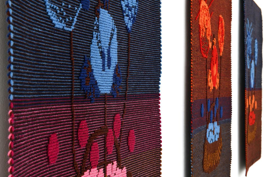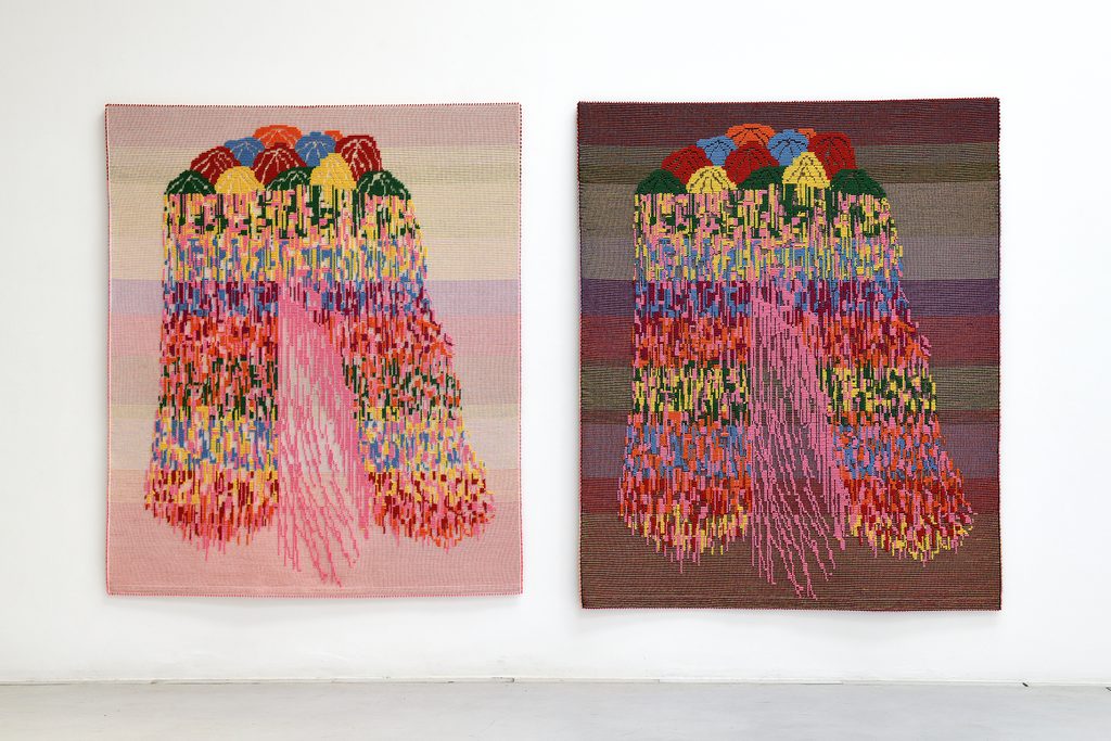 Arazzi. A Verona, nella galleria storica con cui Galtarossa collabora dagli anni duemila, gli straordinari tappeti realizzati appositamente per la mostra personale, svettano nella grande sala (in mostra fino al 16 ottobre 2024). Studio la Città diventa una cattedrale bianca che accoglie grandi ed elaborate creazioni. Al piano di sopra, la fondatrice della galleria Hélène de Franchis ci attende per raccontare, insieme ad Anna, gli ultimi percorsi della galleria, nazionali e internazionali, e il ritorno dell’artista, dodici anni dopo il suo primo progetto personale. Gli arazzi sono grandi composizioni colorate, raffinate, realizzate insieme alle tessitrici dello storico laboratorio sardo M/U Mariantonia Urru con la tecnica del pibiones, in lana e cotone. Grandi montagne che esplodono, tratteggi colorati a segnalare percorsi, colori affiancati e intrecciati tra loro. Alcuni accostamenti di tonalità sono azzardi tecnici che, realizzati a mano sul tessuto, sono estremamente complessi da finalizzare. E, invece, Anna Galtarossa, procedendo tra la sua esperienza nei materiali e il loro assemblamento, insieme a una grande vivacità nella sperimentazione, riesce nell’intento di innovare la resa su queste superfici che sembrano quasi pittoriche.