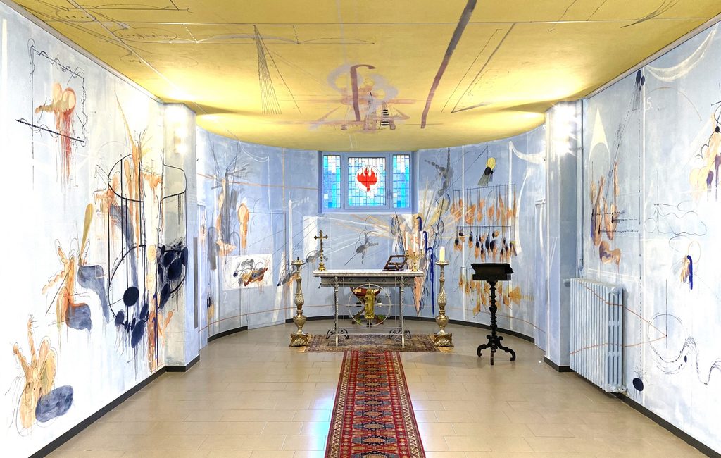 A poche centinaia di metri, a ridosso della ferrovia che taglia in due la città, i vecchi depositi dei treni si sono trasformati in Dumbo, un altro distretto, o forse meglio arsenale, per l’arte. Ancora poco avanti, come nascosta in una grotta sommersa, una vecchia cappella cristiana in S.Maria delle Grazie, si spalanca agli affreschi contemporanei e vivaci del giovane artista Giampaolo Parrilla.
