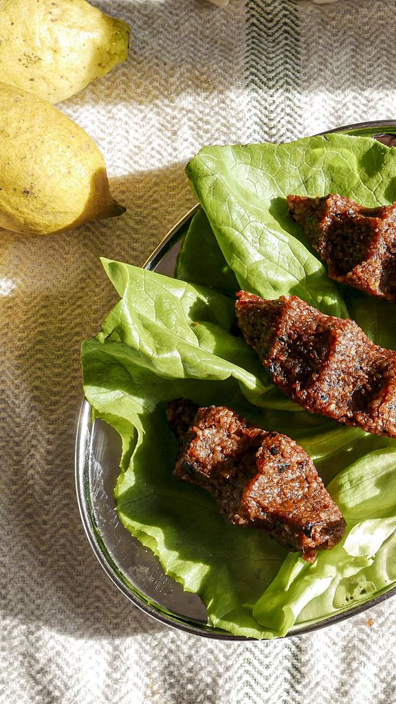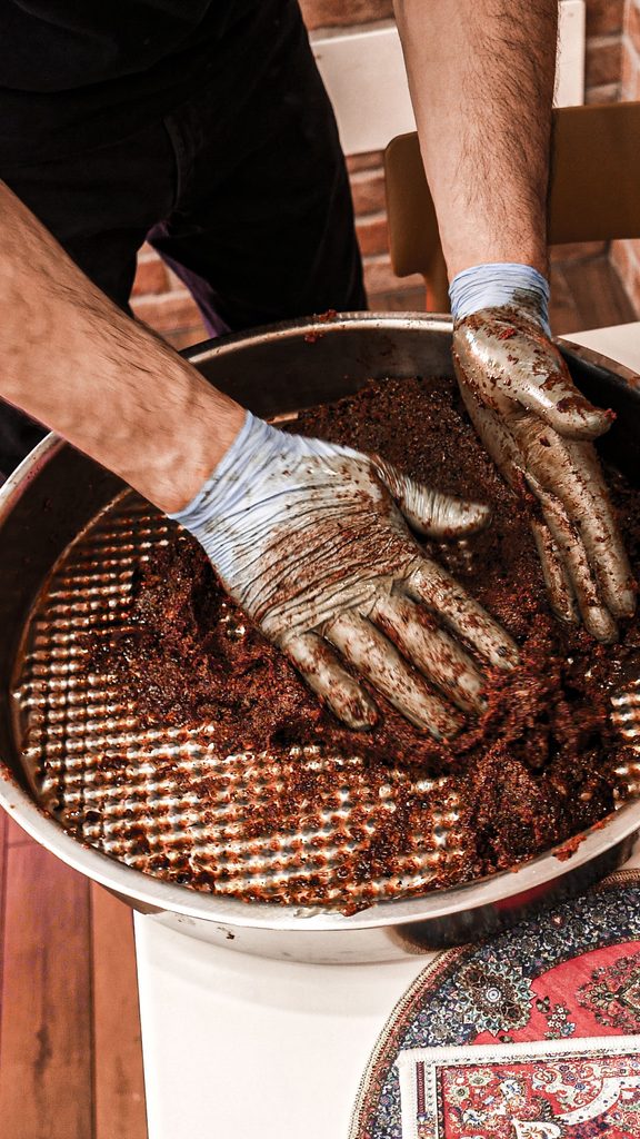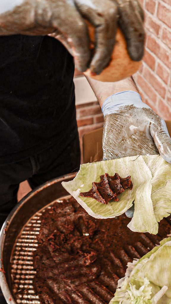 Nato e cresciuto ad Adıyaman nella parte sud della Tuchia, Mahmut fa parte della comunità curda ed è arrivato in Italia negli anni 2000. Stabilitosi inizialmente a Bari, dove si trovava già il padre, lavora in agricoltura, prima di trasferirsi a Trieste per aprire alcuni ristoranti di kebab insieme allo zio e trasferirsi a Bologna nel 2018. Parlando di origini, quella di Adıyaman a pochi chilometri distanza dalla Siria, è una zona consacrata a una cucina variegata che utilizza al meglio la ricchezza di materie prime a sua disposizione, soprattutto di grani e verdure. È, insieme ad Urfa, Adana – la città del tradizionale kebab cotto sulle spade – e Gaziantep, una delle capitali delle çiğ köfte, polpette di bulgur piccante servite per strada e nei ristoranti in tutto il paese. Mahmut ne parla fieramente, mentre la prepariamo insieme (la ricetta e il metodo di preparazione li trovi su Grūmi, la mia newsletter gratuita di cibo e di storie) perché è parte delle tradizioni casalinghe, comunica il calore – attraverso anche la sua piccantezza – e la mano di chi lo fa. La caratteristica è proprio la forma ovale che gli viene data, su cui rimangono impresse le falangi della mano di chi le prepara, prima di essere avvolte in insalata con una spruzzata di limone (per i più coraggiosi si può dare un morso anche ai biber sottaceto, esperienza bella forte).