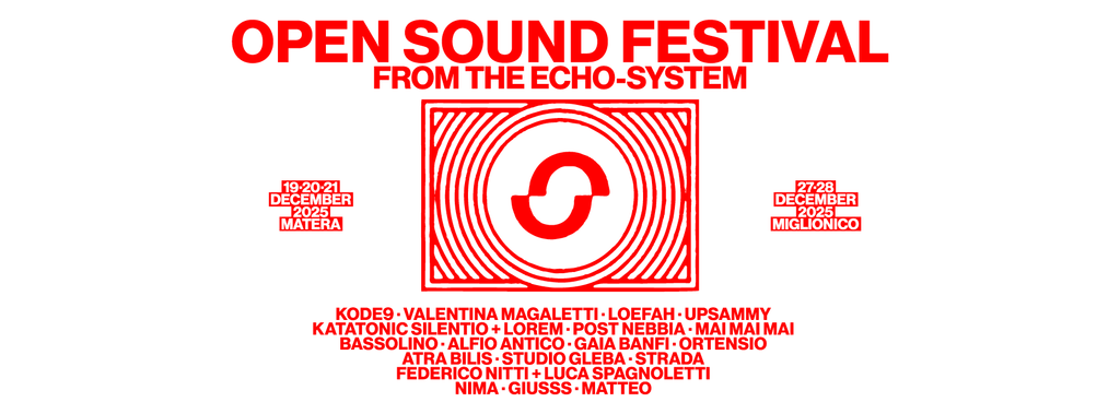Si invertono i fattori climatici e stagionali – dall’estate all’inverno – ma non cambia il risultato, ché è sempre di quelli che rubano l’occhio e mettono in fibrillazione le varie app per organizzare la trasferta (per chi non ha la fortuna di abitare nelle vicinanze). Open Sound quest’anno si manifesta nel bel mezzo delle feste natalizie, tra Matera e Miglionico, e porta con sé una serie di donni che solo Babbo “Aphex” Natale potrebbe caricarsi sulle spalle e distribuire a 240bpm. Il primo weekend della rassegna riparte dalla terra e dai tamburi ancestrali di Alfio Antico, che venerdì 19 dicembre sera sarà affiancato dal dj set di Bassolino. Sabato 20 si chiuderanno le lezioni all’Università di Bari con un’epica lectio tenuta da Kode9 intitolata “Stando nelle basse frequenze, tra archivi sonori e carne elettronica”; Kode9 che la sera si trasformerà da relatore in musicista presentando all’Auditorium R. Gervasio di Matera il suo live A/V “Escapology”, seguito poi dalla prima italiana della performance A/V “Circled Dot” di Katatonic Silentio & Lorem, e dai set di Strada, Giusss e Matteo. Il giorno dopo, domenica 21, si ritorna nel Mediterraneo contaminato con Nima, Mai Mai Mai, Post Nebbia, Gaia Banfi, Federico Nitti e Luca Spagnoletti. Il secondo weekend, 27 e 28 dicembre, sarà più coinciso ma non meno intenso, con la batteria irrefrenabile di Valentina Magaletti e i suoni hypercontemporanei di upsammy a fare da headliner, affiancati da Ortensio, Atra Bilis, Loefah e la performance OSA 2.5 “The Plot”, ideata da Studio Gleba in collaborazione con Alioscia Bisceglia.
