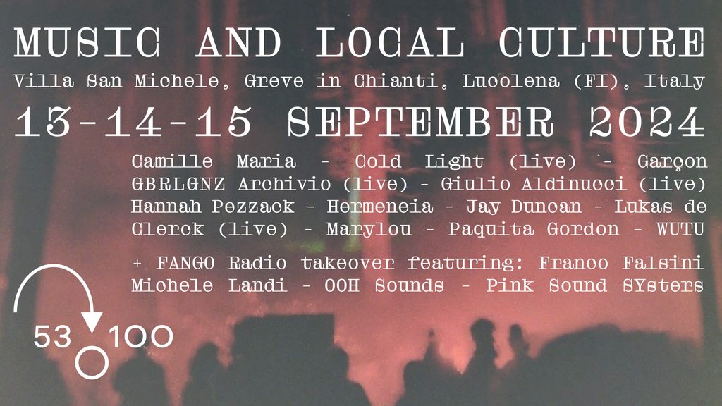 Giunto alla sua seconda edizione, 53100 ha saputo inserire sulla mappa un nuovo punto d’incontro per tutti coloro che amano la musica senza alcun bisogno di categorizzazioni. La formula è chiara: identità artistica, intesa come volontà di condividere la propria visione della musica, e identità territoriale, intesa come porre il contesto al pari di un headliner di spessore. In questo senso il Chianti e Villa San Michele diventano la cornice più adatta dei tre giorni di celebrazioni della Musica e del territorio locale. E dunque le attività volte ad esplorare e comunicare col territorio, come le escursioni guidate e le degustazioni. E dunque una selezione musicale accuratamente ragionata nel dialogo contemporaneo con la musica, con nomi come Paquita Gordon, Garçon, Jay Duncan, Lukas de Clerck ed Hermeneia e con il supporto della locale Fango Radio.