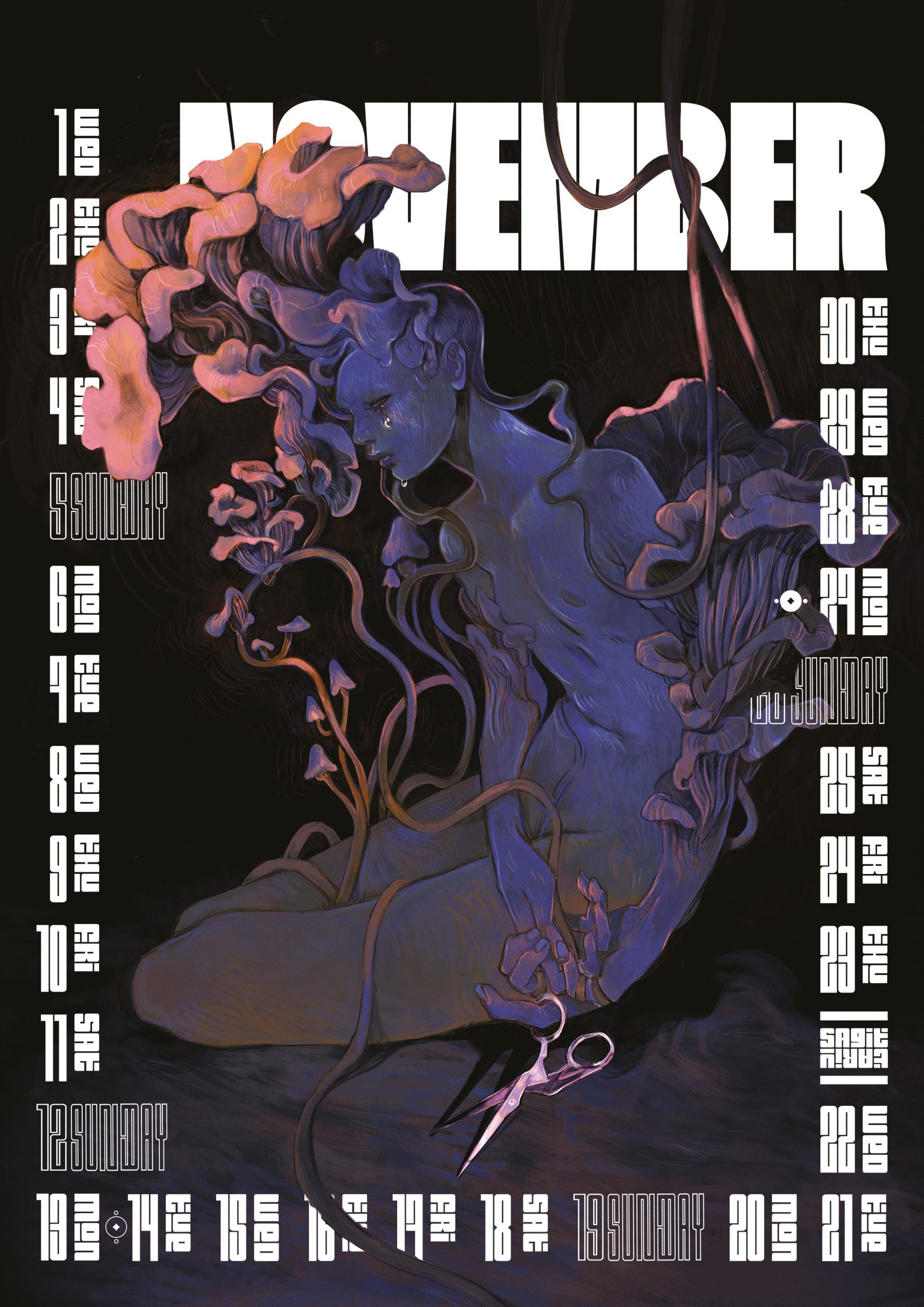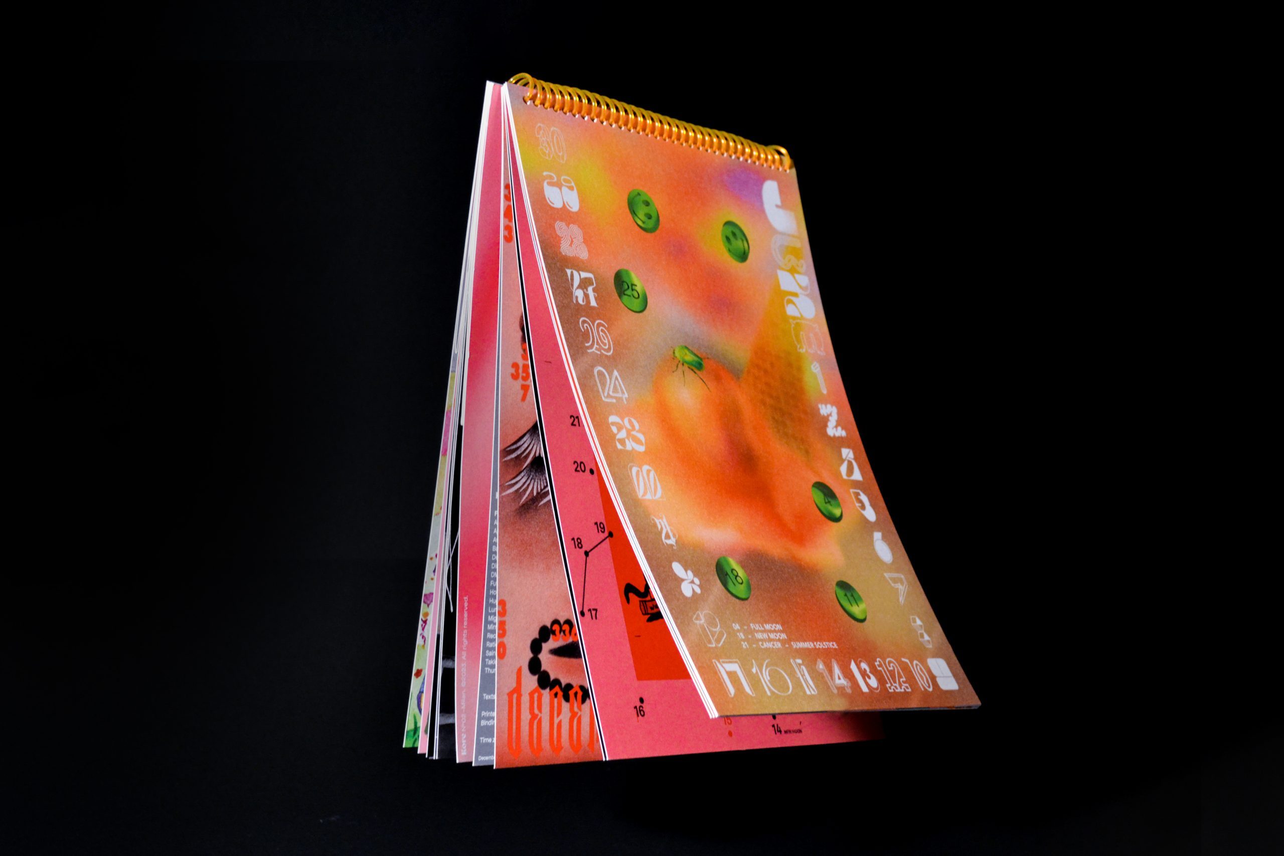Arriviamo dritti al punto del secondo numero, che verrà presentato venerdì 16 dicembre: un calendario in tiratura limitata di 200 copie. Ogni mese è scelto e illustrato da artiste provenienti da diversi paesi: ci sono Alicia Carrera (Spagna), Chenyuè Yuàn (Cina), Abbey Golden (USA), Laina Deene (UK), Anu Ambasna (UK), Jordi NG (Singapore), Harriet Yakub (Irlanda), Soljee Lee (USA), Erika Polizzi (Romania), Marcela Scheid (Brasile), Francesca Azzoni e Livia Giorgina Carpineto (Italia). Tra illustrazione, disegno e installazioni ambientali, si presenta ancora – come il numero scorso – un milieu identificativo di una scena creativa intorno al mondo.