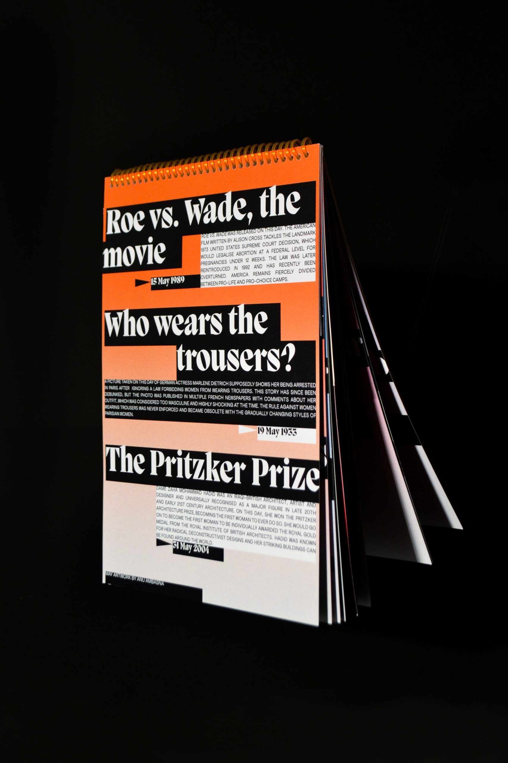 La scelta del calendario poi è quasi politica: tutto segnato con date e ricorrenze “celebrative” riferite a momenti salienti di una storia culturale del Novecento al femminile, tra performance, cinema, hit musicali, pubblicazioni, moda e design. Dalla nascita di Simone de Beauvoir (9/01/1908) all’arresto delle Pussy Riot a Mosca (3/03/2012), passando per la performance VB55 della Beecroft (7/04/2005) fino alla presenza delle opere delle Guerrilla Girls alla 51° Biennale di Venezia (12/06/2015) o all’uscita di Girl Power delle Spice Girls (8/07/1996) e parecchie altre.