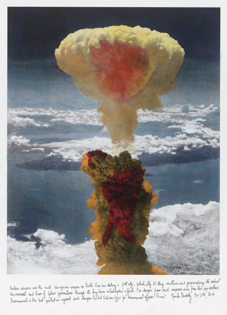 Nuke dell’artista argentino Marcelo Brodsky è un intervento sulla foto d’archivio di un’esplosione nucleare – un nell’atollo di Mururoa – per ricordare che l’unica via per evitare tragedie future è quella del disarmo. «Ho realizzato l’immagine dell’esplosione – afferma l’artista – proprio perché era il 75° anniversario del lancio della bomba atomica a Hiroshima nel 2020, e durante la presidenza Trump non venivano firmati i rinnovi degli accordi nucleari tra Stati Uniti e Russia».