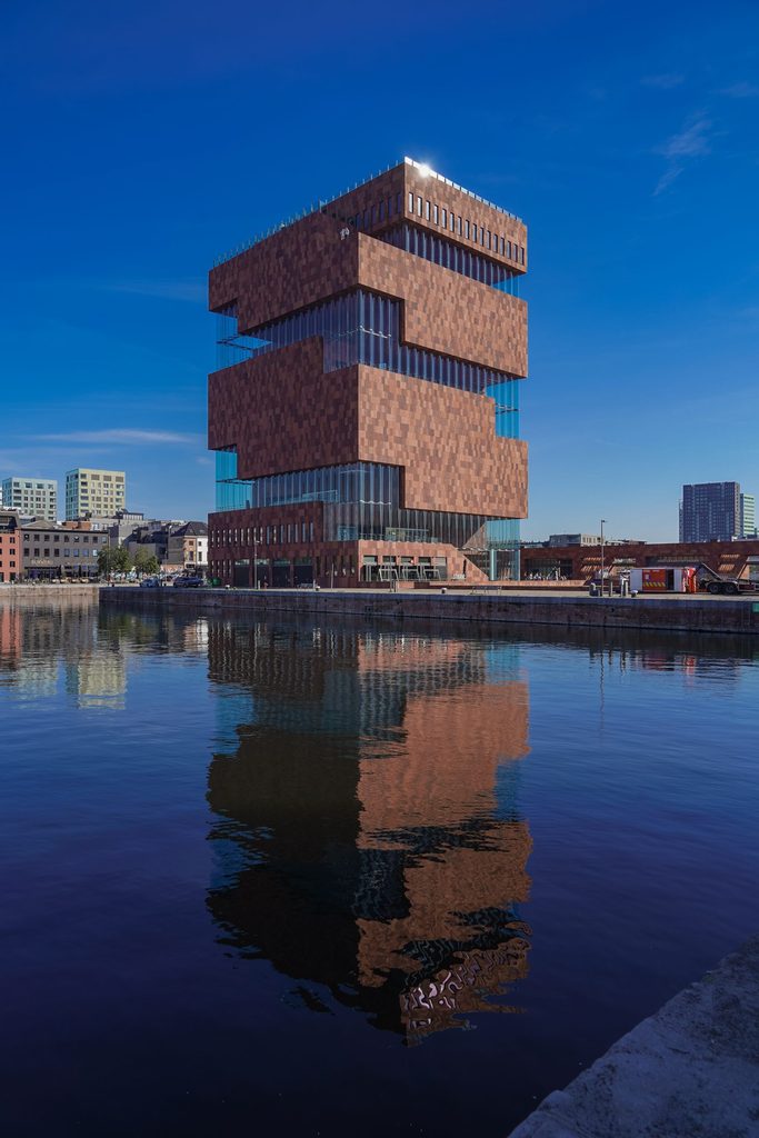 Il primo quartiere verso cui sfrecciamo è a nord: Het Heilandje, chiamata anche “little island”, dove una volta sorgeva il vecchio porto (ora l’attività portuale è più circoscritta a nord fuori dal centro città) e che ora è un distretto post-industriale costituito principalmente da warehouse trasformati in ristoranti, wine bar e palazzi specchiati: è tipo la Brooklyn nordica. La sera prima in una di queste warehouse ho bevuto vino naturale e mangiato quante più ostiche au gratin potesse contenere il mio stomaco, osservando le navi che mi passavano davanti tra la vegetazione sparsa e le lucine del dehors del ristorante Fiskeskur. Su Het Heilandje torreggiano due alte costruzioni: una è il MAS, Museum aan de Stroom, un’architettura che s’affaccia sul fiume Schelda – e infatti tradotto vuol dire “museo al fiume” – in pietra arenaria rossa indiana con pannelli di vetro. La collezione all’interno del museo racconta della storia di Anversa in quanto città portuale, ma si può anche solo salire su in cima con le scale mobili e arrivare sulla terrazza che offre allo sguardo un trait d’union tra i diversi quartieri, che se li pensi separatamente sembrano appartenere ognuno a una città diversa e invece sono tutti qui, in fila, visibili dal MAS. La seconda, più a nord, è la Port House: la sede dell’Autorità Portuale di Anversa che ospita 500 impiegati, progettato da Zaha Hadid, che ha fatto costruire una struttura moderna di vetro sopra all’edificio storico che era un’ex caserma dei pompieri.