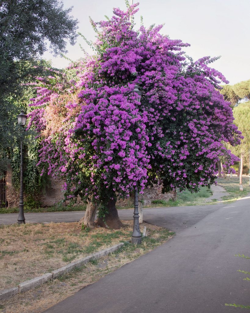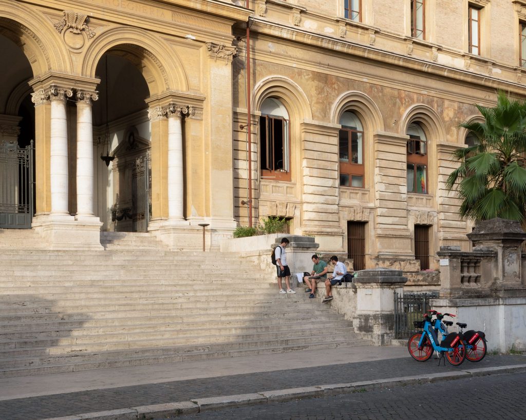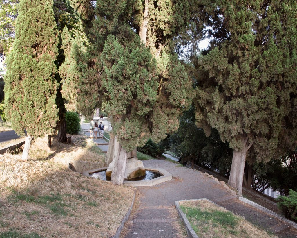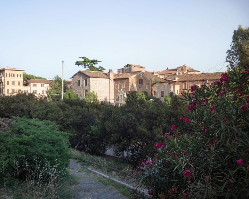E dopo la fatica della salita, la meraviglia della vista: una piazza purtroppo usata come parcheggio ma dalla quale, alle primissime ore del mattino, quando è ancora vuota, si gode un’inedita alba su Roma. E poi, a proposito di scale, quelle della Chiesa alla Basilica Santi Silvestro e Martino, la cui prospettiva – per chi cammina veloce a piedi come noi – ricorda la scala di Casa Malaparte. Salendo per via Equizia, costeggiamo ancora il mattone con lo sguardo bloccato. Forse è questo uno dei fili conduttori della passeggiata. Alla fine di questa, il muro dei giardini di Palazzo Brancaccio fa da grande barriera da cui svettano rigogliose le piante di uno dei giardini più nascosti e più belli del quartiere, dove adesso è rinato Spazio FIELD.