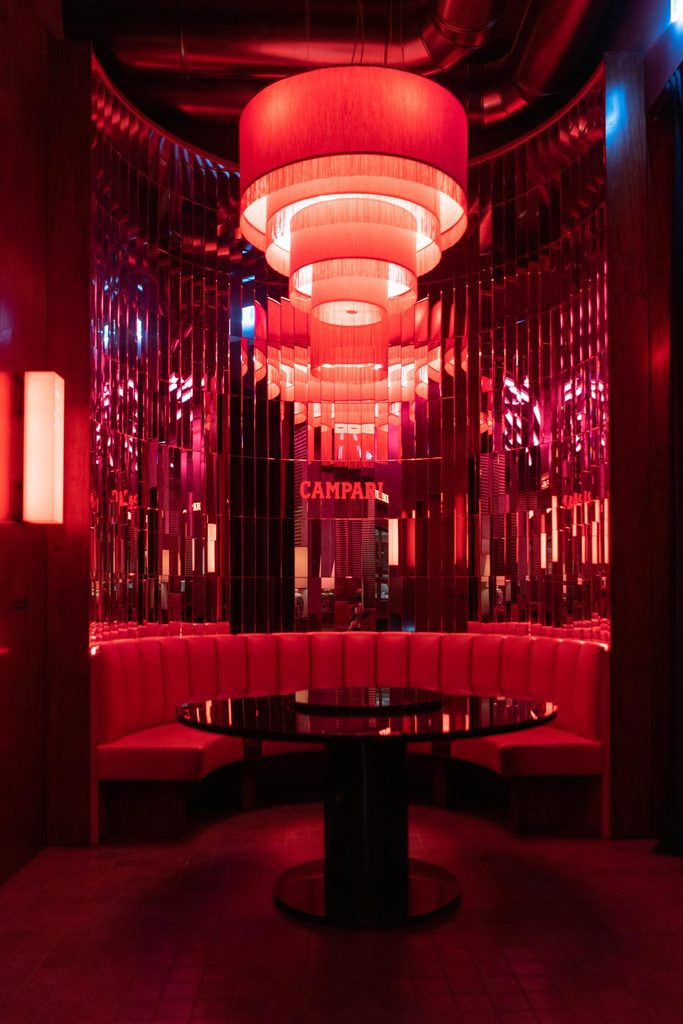 Dopo una parentesi sguaiata con gente sorridente nella sala Karaoke, sulla base di “Moi.. Lolita” di Alizée, scendo per la coreografica scala del Ronin, regina dell’Instagram milanese, dove ai vari piani ci sono diversi performer e caspita, il mio bicchiere è già vuoto. Mi faccio strada al piano terra dove ci trovo i ragazzi del Camparino in Galleria che mi versano un Campari shakerato in men che non si dica. Ma a ogni piano ci sono cocktail diversi da provare, stazioni bar e bar cabinet che spuntano da ogni dove: un paradiso rosso.