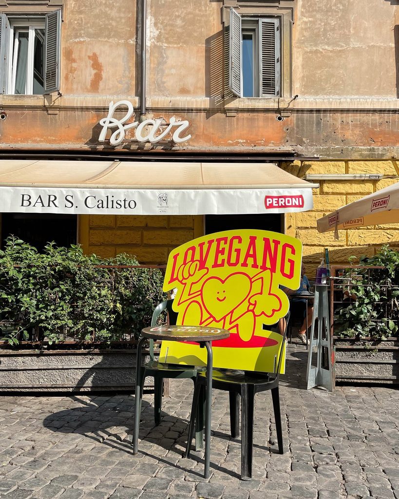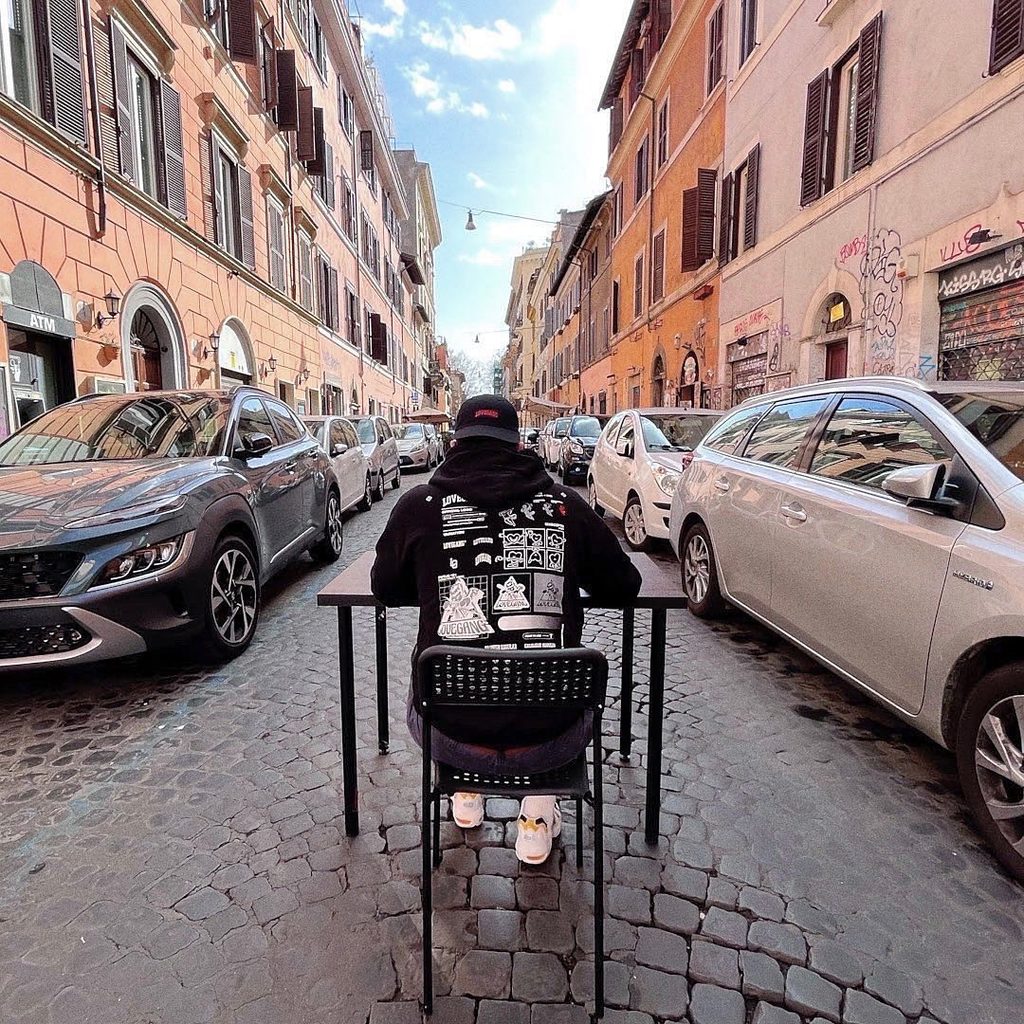 Alla LOVEGANG va gran parte del merito nell’aver riportato Trastevere dentro al linguaggio e le abitudini delle nuove generazioni romane. La mitologia costruita da Ketama126, Pretty Solero, Carl Brave, Franco126, Drone126, ASP126, Ugo Borghetti (per altro in procinto di pubblicare il loro primo disco come collettivo) negli ultimi anni si è marchiata a fuoco nelle sinapsi degli ascoltatori. Una narrazione semplice nell’accezione più qualificante possibile, che ha proiettato il quartiere e i suoi luoghi iconici nell’immaginario di pischelli pronti a brindare con le Peroni da 66 nella stessa piazza in cui i turisti americani spendono trenta euro per un cappuccino con pasta. Su via San Francesco a Ripa, al civico 6A/6B, c’è lo store del LOVEGANG BRAND. “Tutti i giorni in piazza c’è qualcuno che suona qualcosa” ci dice Filippo Lancellotti, che gestisce tutte le attività legate al brand e alla crew romana, oltre alla nuova serata dedicata al clubbing, LOVECLUB.