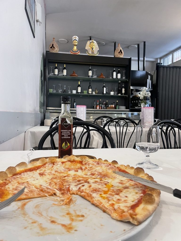 Il pane aveva un rassicurante profumo di forno, un pizzico di sale, ed era lievitato alla perfezione. Ad ogni crack della crosta seguiva una mollica leggera che raccoglieva il sugo della pasta alla diavola che avevo ordinato, mentre avventori della zona, lavoratori e amici ridevano, chiacchieravano e si godevano l’ambiente rilassato della pizzeria. Un televisore mandava il telegiornale con le notizie del giorno e le piante adornavano gli angoli del ristorante – un’ambientazione quasi domestica che mi ha subito messo a mio agio. La pizza a seguire (sì ho preso sia pasta che pizza) era della stessa pasta (gioco di parole voluto): profumata, croccante ma friabile, gustosa ma leggera.
