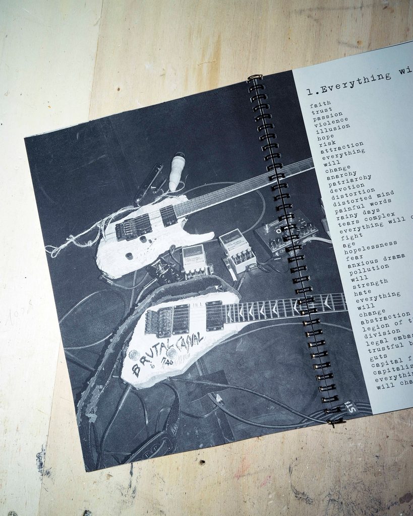 Azione, spontaneità, autodocumentazione: in quest’ultimo anno, le residenze sono state senza dubbio una delle cure più efficaci per sopperire alla totale assenza di performance da vivo e allo svuotamento degli spazi di aggregazione. Una pratica antica nel teatro e nelle arti performative – ma ancora poco adottata e sviluppata per la musica – che nell’annus horribilis per la cultura “in presenza” ha permesso di dare continuità, prospettive e sostentamento ai progetti artistici ma anche di tenere in vita i luoghi dell’arte cercando man mano di mantenere il contatto anche con il proprio pubblico. Azione, spontaneità e autodocumentazione sono tre parole chiave (a cui forse, nello specifico, aggiungeremmo anche “sottocultura”) per entrare nella dimensione dell’esperimento Brutal Casual e visualizzarne la sua concretizzazione su più livelli di produzione artistica. Il progetto performativo/editoriale ideato dal fotografo e visual artist Jacopo Benassi e dalla musicista e dj Lady Maru è una delle residenze musicali (invero non moltissime) più avventurose che hanno preso forma in Italia nell’ultimo anno, nello specifico all’interno di “Prender-si Cura”, programma di residenze artistiche e produttive, ideato e curato da Ilaria Mancia, che dalla scorsa estate e fino al prossimo agosto si stanno svolgendo negli spazi de La Pelanda: artiste e artisti invitati a sviluppare la propria ricerca, dalla danza alla performance, dall’arte visiva alla fotografia – passando, appunto, per il noise, le sottoculture e l’editoria DIY. Un esperimento, Brutal Casual, che parte dalla performance sonora live – nel frullatore emb, industrial, synthpunk e noise – per arrivare alla produzione di un magazine composto da slogan fotografici e sonori, passando attraverso un utilizzo in tempo reale e documentaristico della macchina fotografica e del registratore.
