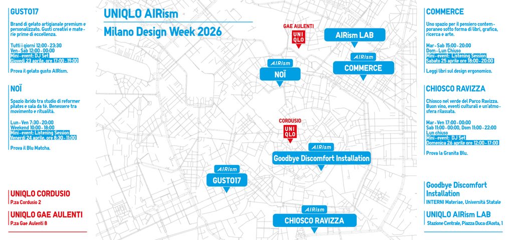 Il concetto di comfort come design si diffonde per la città grazie a quattro partner: GUSTO17, NOÏ, COMMERCE e CHIOSCO RAVIZZA. Per tutta la settimana dal 20 al 26 aprile, ognuno propone un prodotto ispirato alla filosofia AIRism, dal gelato dedicato di GUSTO17 al Blu Matcha di NOÏ, dai libri sul design ergonomico di Commerce fino alla Granita Blue del Chiosco Ravizza. Il cuore dell’iniziativa saranno però i giorni di attivazione, eventi tematici dove sarà possibile ritirare un kit omaggio: un pack con un prodotto AIRism e l’edizione speciale di ZERO.
