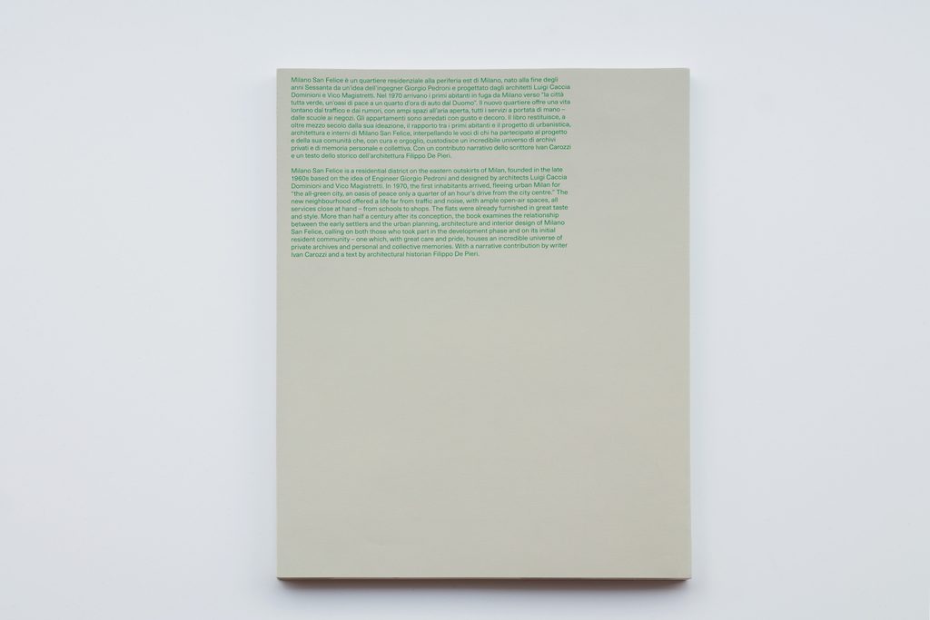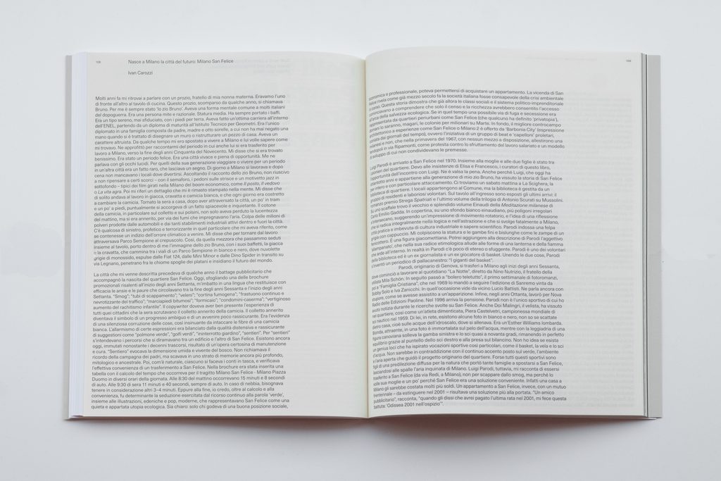 La potenza e l’interesse per il successo di San Felice sta proprio qui, nella postura comunicativa e progettuale che ebbe fin dall’inizio, e che Carozzi coglie benissimo dalla storia del “colletto annerito”: il verde. La promozione del quartiere si dispose come contraltare a una Milano che s’anneriva nello smog, nel particolato del traffico e nell’industria rampante, e si raccontò nella cornice del sogno boscoso e del sentimento comunitario (tornando a Rosa Marina e al vacanziero, la si è letta altrove così: «A Rosa Marina il tempo non scorre come in città e un minuto è fatto di sessanta intensi secondi. Rosa Marina è l’Estate, è il paese dell’eterna giovinezza»). Fatto che si vede nitidamente dalla sezione d’archivio del libro, dove vengono riportati stralci dei pamphlet pubblicitari come: «Vedremo mai la corsa della lepre attraverso i golfi?», «Questa città non l’ha creata Walt Disney. Eppure è una città da favola», fino a «Mamma, cos’è un prato?» in un inserto pubblicitario in bianco e nero dove una foto ritrae due bambini giocare sull’asfalto. Ricorrono quindi i rimandi ai “polmoni”, ai “sentieri” e ai celebri “golfi verdi”, che valgono tanto come informazione promozionale e immagine suggestiva quanto come stilema estetico e progettuale del quartiere, pensato oltretutto dai due grandi progettisti a cui venne affidata la progettazione del San Felice: Luigi Caccia-Dominioni e Vico Magistretti. I golfi verdi sono così a tutti gli effetti degli aggetti da balconi, logge e vetrate, insomma da alture che si affacciano sui larghi parchi incastonati da palazzine e case basse, tutte disposte sull’andamento curvilineo di strade, percorsi e sentieri, tra i quali si infrascano le villette isolate nella vegetazione. C’è poi un lago artificiale, il Malaspina, un campo da golf, di tennis, una palestra, da poco un centro di quartiere, una biblioteca, nonché un cinema di quartiere. Tra i racconti più rappresentativi, ci sono aneddoti di gente che finisce accidentalmente nelle rogge, la nebbia fitta per tornare a casa, il ronzio perturbante e costante delle zanzare, i fagiani, i gruppi ecologici negli anni Settanta ostili alla caccia, e pure le eccezioni più radicali e folli, come la presenza di Vito Cosmai, fondatore e inventore di Emoscambio, che molti ricorderanno per le scritte sulle provinciali (ΣMOSCAMBIO) e le storie sull’amplesso “naturale” che un po’ a noi lasciano il sapore di un’ecologia profonda e giusto un poco deviata.