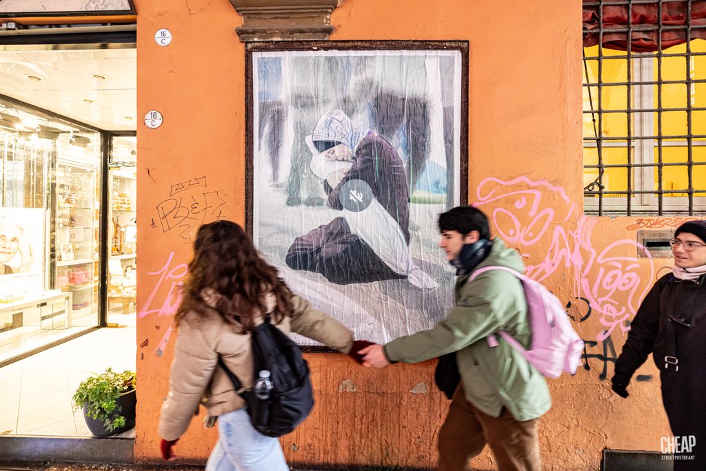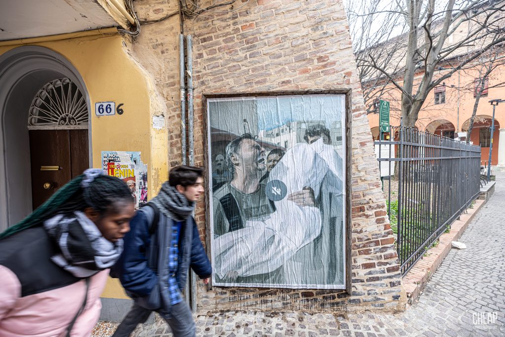 Dal sito #UNMUTEGAZA chiunque è inviato a scaricare e stampare le opere realizzate per denunciare la situazione in corso ed è quello che è stato fatto da CHEAP con le immagini realizzate a partire dalle foto di MahmouD Bassam e Belal Khaled oggi su alcune bacheche affissive di Bologna.
