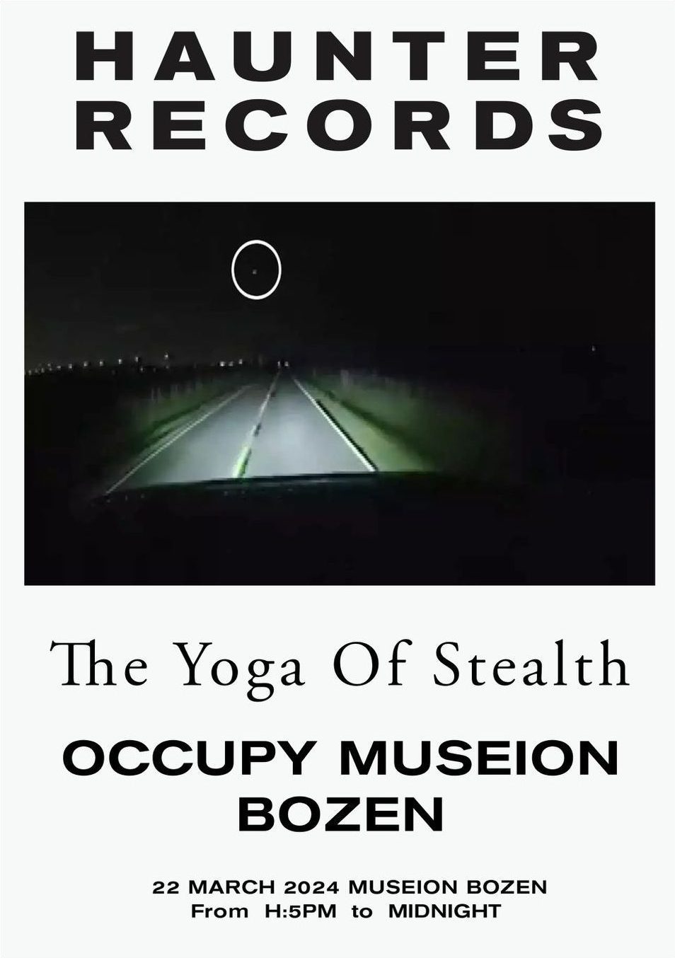 Per dare spazio a questa conversazione su che cosa significa essere una realtà frammentata nel nostro mondo di città invivibili e infrastrutture alternative, questo weekend Museion si fa guidare da Haunter Records e, in occasione dell’apertura delle mostre RENAISSANCE ed Ezio Gribaudo e The Weight of the Concrete, Museion Art Club, Forum indipendente che organizza eventi paralleli alle attività museali, presenta OCCUPY Museion – The Yoga of Stealth.