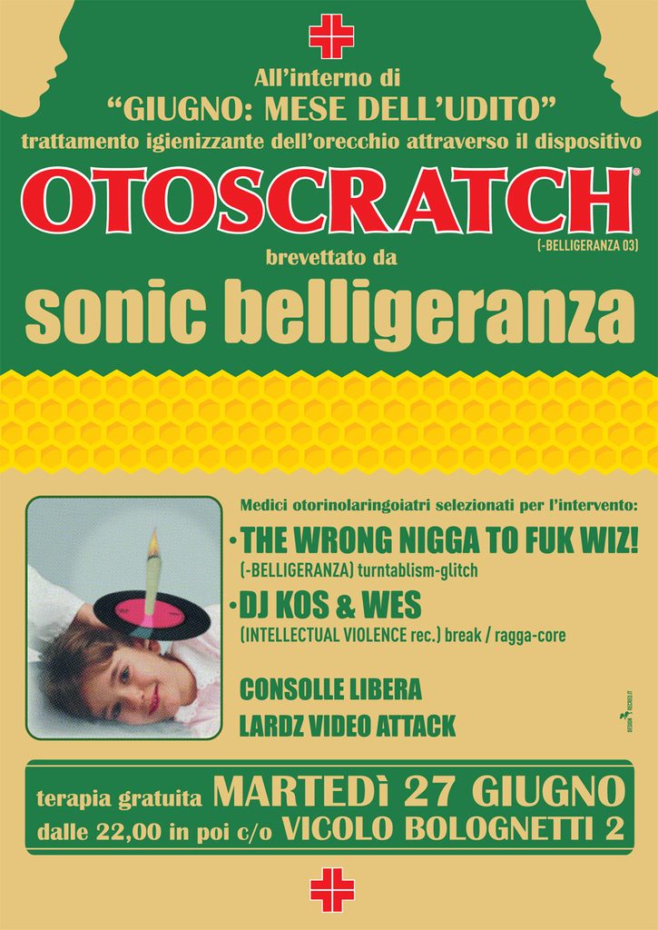 Quando però il genere arrivò in Italia, un paese la cui vasta scena free party era profondamente legata ai movimenti controculturali e alla sinistra radicale, rimase per lo più un’iniziativa individuale. Balli iniziò presto a portare tutti i suoi amici di Dead By Dawn al Link Project. Poi, nei primi anni 2000, cominciò a organizzare feste di breakcore presso il centro sociale di Vicolo Bolognetti nel quartiere di San Vitale a Bologna, rimanendo a lungo l’unico vero promotore del genere in tutto il paese. Non ci mise molto a lanciare a sua volta un’etichetta: Sonic Belligeranza, un manifesto per la sua visione di ciò che la breakcore poteva diventare: un po’ qualsiasi cosa, in pratica. Superando le radici più orientate verso il rave e abbracciando l’idea situazionista di rivolta culturale giocosa, Balli utilizzava la breakcore come mezzo per sperimentare, decostruire e sovvertire elementi della cultura popolare, tramutandoli in sgradevoli e inquietanti strumenti di deprogrammazione di massa. Affrontando ogni nuovo progetto con lo stesso radicalismo, contribuì a trasformare il genere in qualcosa di sonoramente sfuggente e concettualmente difficile da definire. La sua visione, sebbene distinta, completò quella di Scud, creando una cacofonia non solo musicale ma anche culturale.