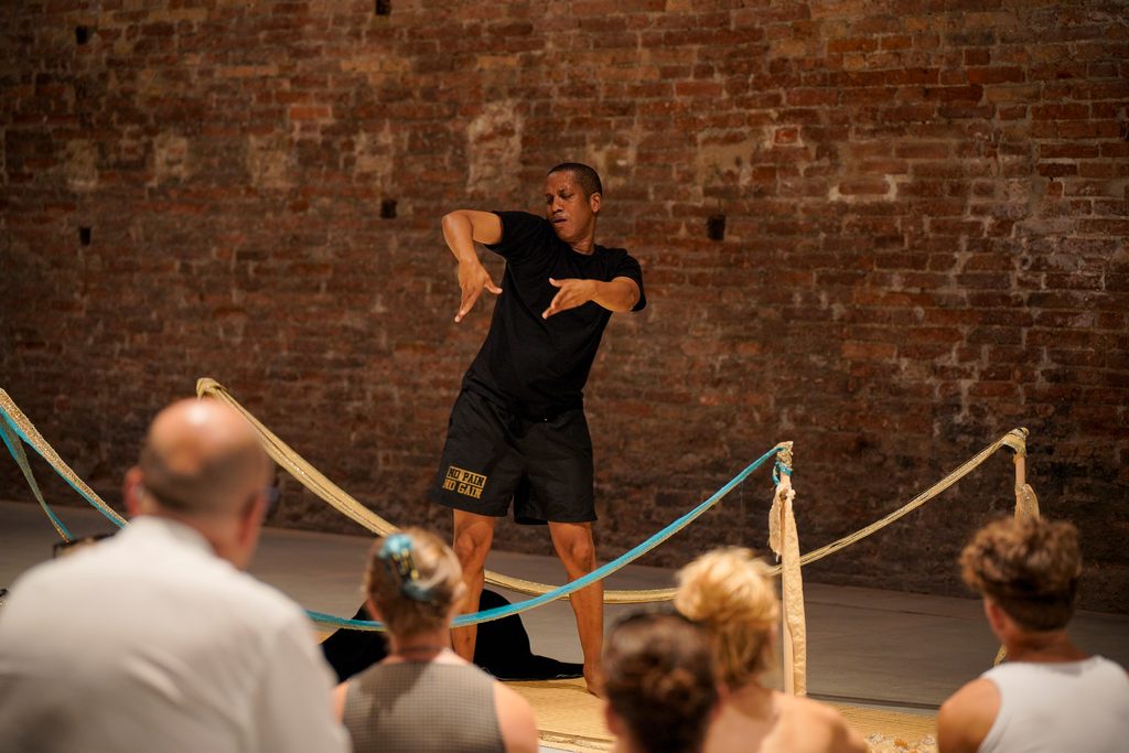 Meno sorprendente è stato invece il Leone d’Argento a Trajal Harrell, coreografo e interprete nato e cresciuto in Georgia, che negli ultimi anni sta facendo rumore in tutto il mondo con la sua presenza nei festival, nei musei e nei teatri più prestigiosi d’Europa e d’America. La sua produzione mescola linguaggi come il vogueing a forme di danza preesistenti, indagando temi come la razza, il gender e la politica nell’America coloniale, sempre con una delicatezza e una presenza scenica contemporaneamente penetrante e mai invasiva, che destabilizza non poco il pubblico. Anche lui presenterà a Biennale Danza diversi lavori di cui l’ultimo, Tambourines (2024), sarà in programma negli ultimi due giorni di festival.