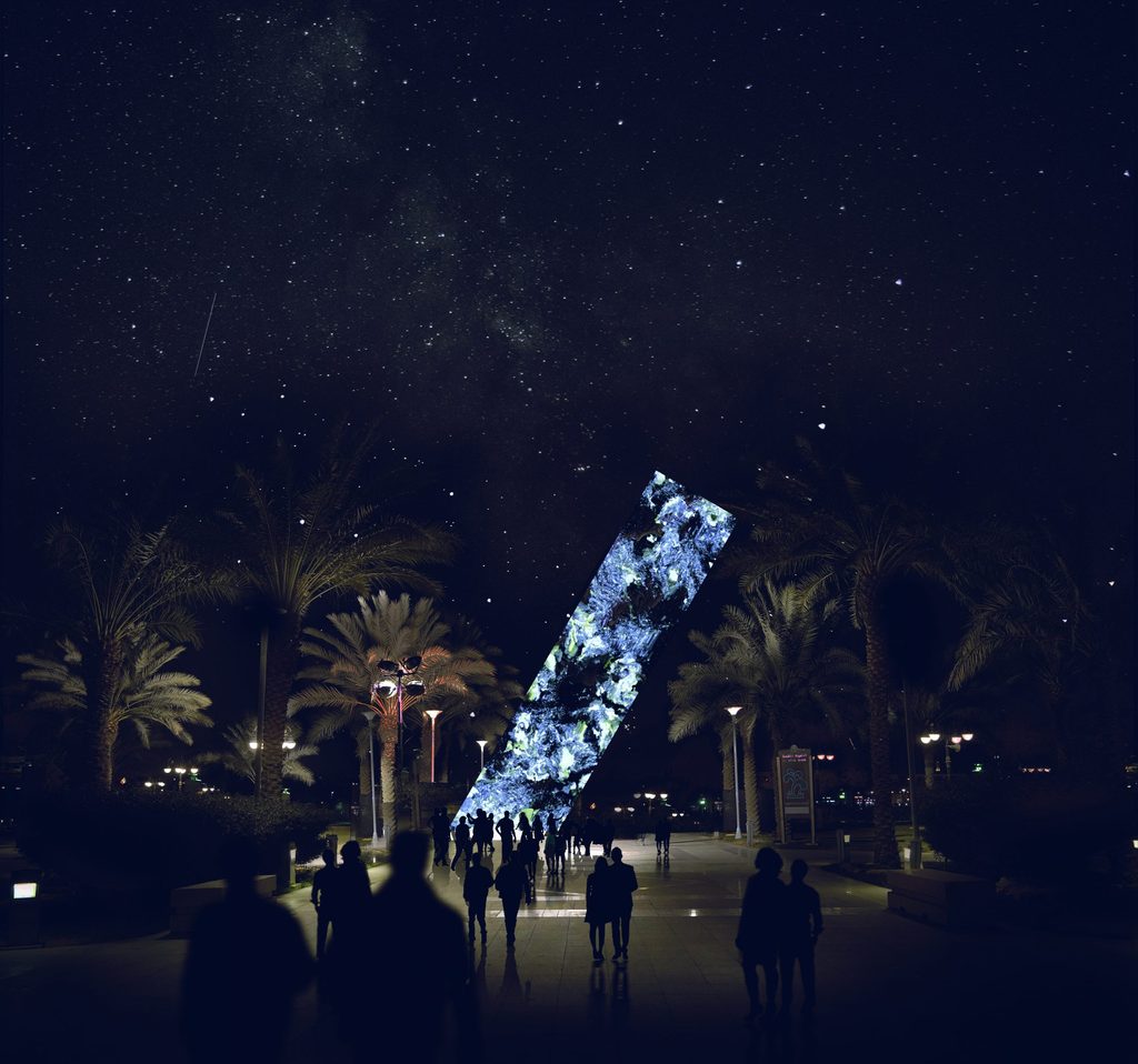 Una comunicazione dinamica attraverso luci e suoni, a migliaia di chilometri di distanza, una materializzazione cibernetica dell’effetto farfalla, per riflettere sull’interconnessione che avvolge l’intero pianeta: “il passaggio di un visitatore a Riad genera un’onda digitale a Roma, una goccia di pioggia a Roma crea una cascata di pixel frammentati a Riad”. Anche quando gli spettatori non saranno presenti l’installazione continuerà a comportarsi come un organismo vivente, attivato da elementi invisibili come la pressione atmosferica, l’umidità, i raggi UV, il passaggio di piccoli animali o il lieve soffio del vento, che daranno vita a forme stroboscopiche e policromie fantastiche, a suggerire che il vuoto è in realtà un costante brulicare di vita.