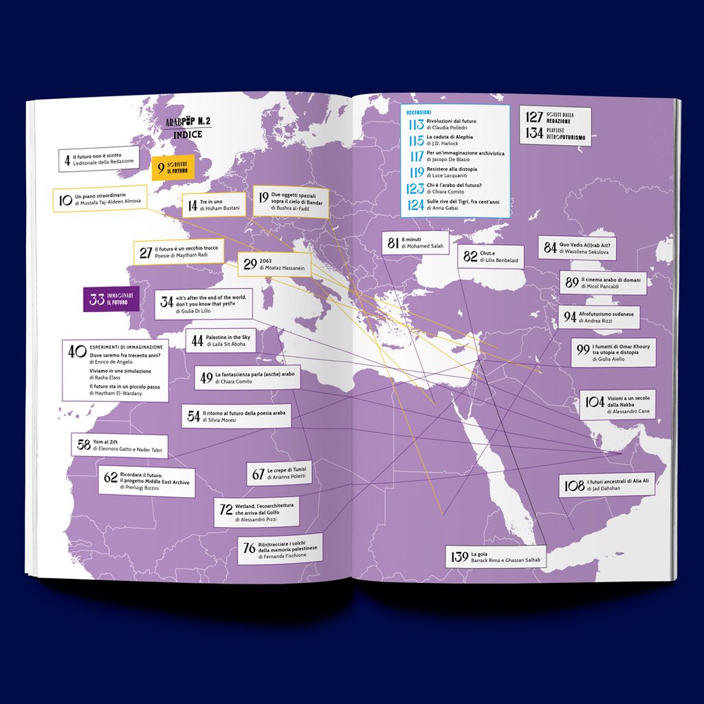 Con “Futuro” abbiamo voluto approfondire anche noi un tema che negli ultimi tempi è stato esplorato in lungo e in largo da varie discipline e che è molto presente nel dibattito intellettuale e nelle pratiche artistiche attuali. I contributi sono decisamente più omogenei rispetto a quelli di “Metamorfosi”, e mentre ci arrivavano gli abstract per la selezione ci accorgevamo che emergevano dei filoni abbastanza chiari. I futurismi femminili di Larissa Sansour, Alia Ali e Sophia Al Maria, che secondo me sono abbastanza “hardcore” in termini di estetica e di concept, si sono ritrovati accanto a numerose riflessioni sull’archivio, che è una specie di capsula del tempo futuribile. In Arabpop il racconto di questa dimensione “archeologica” del futuro si srotola guardando a collezioni dal basso di vecchie fotografie dai paesi arabi, come Middle East Archive, o alle migliaia di musicassette e vinili palestinesi che stanno tornando alla luce grazie a Majazz Project. Anche per fare la playlist del numero mi sono ispirata a quest’accezione di futuro come idea di cui è possibile scrivere la storia, e l’ho intitolata retrofuturismo proprio perché cercavo le tracce della “futurità” nella musica degli anni Settanta, piena com’era di suoni spaziali e di aggeggi elettronici allora appena apparsi sul mercato.A questo poi si aggiunge la nostra sezione letteraria, con contributi che danno un’idea della grande varietà che caratterizza la fantascienza araba oggi, ma che soprattutto ci fanno capire come il futuro sia sempre un pretesto per parlare del presente.